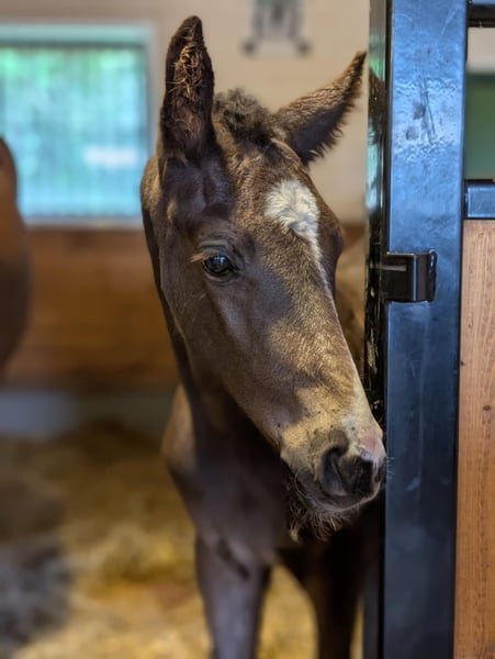 Diese elegante junge Stute überzeugt durch ihre hervorragende Konformation mit langen Beinen und vielversprechender Größe. Sie besitzt ein äußerst freundliches Temperament, liebt Aufmerksamkeit und zeigt großes Potenzial, um eine zukünftige Dressur-Superstar zu werden. E. Skyline to B ue. For romance |