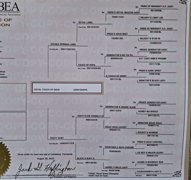 DOUBLE SPRINGS LABELROYAL LABELTOUCH OF PAPAPRIDE'S ROYAL MASTER (HOF)PRIDE'S GOLD MISTGENERATOR'S MY PAPAA TOUCH OF SPIRIT