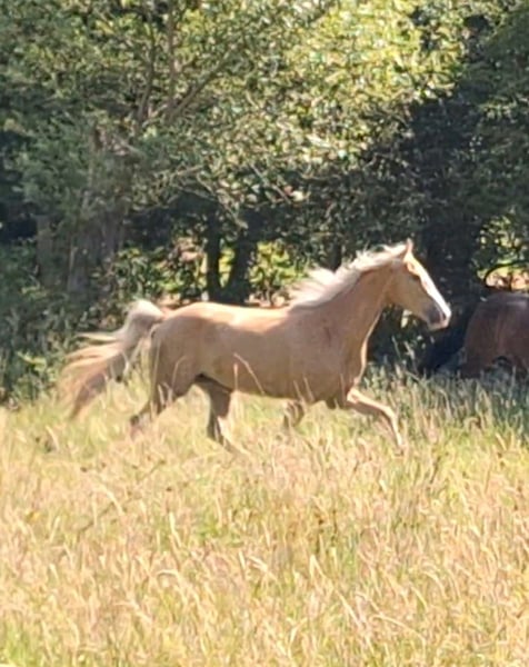 Royal Touch Of Gold aka „April“, ist eine 4-jährige, wunderschöne Palomino Stute. Ihr Pedigree spricht für sich. Ihr Vater ist Double Springs Label, der von Royal Label (Multi World Grand Champion) abstammt. Sie ist derzeit ca. 154cm und noch im Wachstum und besticht durch ein solides Fundament! Im Freilauf zeigt April einen schönen Flat Walk mit einem überzeugenden Overstride, sowie Running Walk. Sie hat dabei das typische Kopfnicken eines Tennessee Walking Horse. Ihre Lieblingsgangart ist ein wunderschöner Schaukelstuhl-Galopp. Diesen Canter beherrscht sie in allen Varianten. Von sehr langsam bis höheres Tempo. Für Gangpferdefreunde, die offen für alle Rassen sind und auf eine solide Gangveranlagung schauen, werden mit ihr ebenfalls ihr Glück finden. Je nach Vorlieben, kann die Veranlagung (auch Tölt) gefördert und ausgebildet werden. Ein Rohdiamant. Z.Bsp. kann ich sie mir sehr gut als viergängig (mit Tölt) gerittenes Pferd in Prüfungen vorstellen, wie z.B. in der Mehrgang-, Viergangprüfung, Pleasure, Gaited Working Equitation, Trail… und durch ihre selbstbewusste und unerschrockene Art, natürlich auch als Luxus Freizeit- und Geländepferd. Ihre Welt durfte sie als Handpferd kennenlernen (s. Videos). Um in den Wald zu kommen, ist es für uns normal die Pferde zu verladen und zu fahren. Auch das lernte April früh und selbstverständlich kennen. Durch Spaziergänge durch den Ort ist ihr der Straßenverkehr bekannt, wie auch andere Umweltreize, die damit einhergehen (Schulbus, Radfahrer, Baustellen, Trecker, Unterführungen usw..). Auch Spaziergänge ohne pferdische Begleitung macht sie gut. An Auswärts-Veranstaltungen hat April bereits teilgenommen, wie zB. Outdoor-Trail und Indoor-Trail, sowie an einigen Bodenarbeitskursen. Anhänger fahren und in einer fremden Umgebung auszusteigen, in einem fremden Paddock zu verweilen, macht sie gut. Fremden Pferden und neuen Dingen ist sie aufgeschlossen. Sie ist selbstbewusst und nervenstark. Ein feinfühliges Pferd, das auf kleinste Signale reagiert und einem Jungpferde erfahrenen Menschen viel Freude bereitet. Sie kennt Sattel und Trense und läuft erste Strecken mit Reitergewicht. All das macht sie gut mit (bei weiterer Ausbildung steigt der Preis). Sie ist lieb beim Impfen und beim Schmied, lässt sich gern im Sommer waschen und abspritzen... Sie lebt in einer gemischten Herde, worin sie sich in der mittleren Rangfolge befindet. Sie ist geimpft und wurde regelmäßig entwurmt. Zu ihr gehören TWHBEA Papiere, sowie einen Equidenpass. Wegen ihrer guten Abstammung und ihrer wunderschönen Farbe (sie besitzt mindestens ein Cremegen), ist sie auch für die Zucht interessant. Wir wünschen uns erfahrene Pferdemenschen, die Freude daran haben, ein junges Gangpferd weiter auszubilden.