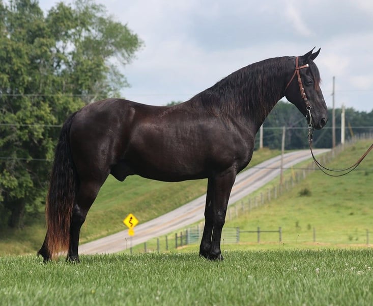 ONLINE AUCTION Place your bids at www.PlatinumEquineAuction.com Starting Bid $3500 Auction ends June 23rd, 2024 Need a new saddle? Check out White Rock Saddles on our website or Facebook Dodge is a SUPER STOUT built 15.1hh, 10 yr old, Black Gelding and man oh man isn’t he a sharp looker? With that jet black color, he is dressed for a night out on the town, WOW he is a looker! I bought Dodge from some local folks who had owned him for 4 years. He has been trail ridden in several states, been ridden downt he highways and though town. Hes even been tied up at the hitching post at the local store while they went inside. Dodge has a natural 4-beat gait that is very smooth at all speeds for any rider. He has been ridden around farm equipment, ATV’s, and around noisy tarps. On the trails he is always great! Dodge has been exposed to all kinds of wildlife such as deer or turkey or other animals like cows or dogs and will go anywhere that he is asked too. He has been rode many miles in the mountains of Eastern Kentucky and encountered every obstacle possible on the trail. He will go up or down even the steepest slopes, across deep creeks, over downed trees, and over all types of rough terrain while still being sure footed. He has been rode in traffic, and is very traffic safe around cars, semi, log, and dump trucks. He has a great personality and a great attitude about whatever he is asked to do. Feel free to call Trevor Patrick 606-516-8069 with any questions. Located in Parkers Lake, KY. ONLINE AUCTION Place your bids at www.PlatinumEquineAuction.com Starting Bid $3500 Auction ends June 23rd, 2024 Need a new saddle? Check out White Rock Saddles on our website or Facebook