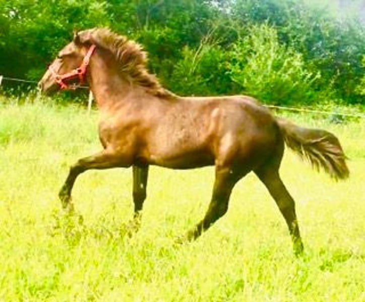 I am offering Timing, a very rare black foal of American breed with a pleasure saddle horse pedigree. He is registered with the American Pleasure Saddle Horse Registry and Tennessee, with French papers as well. At just one year old, he is a unique and exceptional foal, the only one of its kind in France. He will reach at least 16.1 hh when fully grown. He has a thick mane, is well-built, hardy, and has good hooves. His gaits are ground-covering, light, and supple, with engagement. He is destined to become an endurance horse, offering great comfort like his parents. Versatile across disciplines, including TREC. He has been handled since birth, including at the hitching post, trimmed, and educated, both in a herd and alone. Born on our small farm with a dog, in our beautiful mountains, he lives outdoors year-round. Respectful of humans, affectionate, calm, mentally sound, and well-balanced. He is in perfect health, up-to-date on vaccinations, and dewormed. His bloodlines include Ebony, Midnight Sun, Undertree, Pride Generator—old and champion lines. Please feel free to contact me.