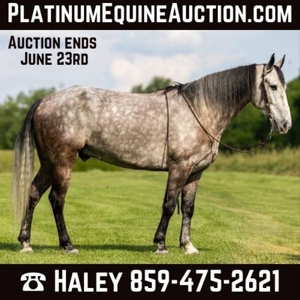 ONLINE AUCTION Place your bids at www.PlatinumEquineAuction.com Starting Bid $3500 Auction ends June 23rd, 2024 Need a new saddle? Check out White Rock Saddles on our website or Facebook! If you are looking for a trail horse on Saturday and then a horse to put on the rail Saturday night to win you some blue ribbons, look no further! Let me introduce you to Nelly. Nelly is a 6 year old DAPPLED GREY gelding. He stands 15.3 hands tall and will weigh 1100 lbs. Nelly has been used on the trails and in the show ring. He has a beautiful head set and will move out with a lot of action and style! Through the trails, Nelly will cross all obstacles with confidence rather that be trees, stumps, hills or water when asked. He is brave, sure footed and confident. He has been ridden in local fun shows and leaving with many blue ribbons! Nelly is a very personable horse! He will meet you at the gate every time! He is very gentle and doesn’t have a mean bone in his body! He stands to be saddled, bridled and groomed! He will park out on command with a tap on his shoulder! Stands for mounting and dismounting with or without a mounting block! If you’re wanting a lot of complements on the trail or a bunch of ribbons to hang on the wall, Nelly is your winner! For any other information please contact PR Quality Horses Colton 606-748-9009 or Haley 859-475-2621. ONLINE AUCTION Place your bids at www.PlatinumEquineAuction.com Starting Bid $3500 Auction ends June 23rd, 2024 Need a new saddle? Check out White Rock Saddles on our website or Facebook!