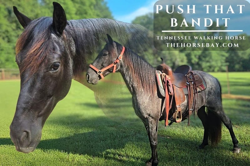 PUSH THAT BANDIT (BANDIT) Bandit is an 8 year old, 14 hand, TWH gelding. He is an absolutely beautiful blue roam with a flowing mane and tail. He is truly an eye catcher. Bandit loves attention and is usually the first horse to welcome you in the pasture he shares with three other horses. He’s number 3 in the pecking order. He is a very easy keeper. He receives one boiler of feed a day with his vitamins. Bandit stands to be bathed, is easy to load, is easy to catch and wants to please. He stands still for you to saddle and mount. In one clip, my wife is saddling him from the back of the trailer saddle compartment. She clues him to move toward her as she places the saddle on his back. He is very intelligent and loves a gentle touch. He puts his confidence in his rider. We talk to our horses and the word “EASY” is a key word. Bandit has been ridden on the trails in Louisiana, Arkansas, to the Shawnee National Forest in Illinois. He goes where you ask him to go. We do a lot of riding in the woods and on the trails. He has no problem crossing water or bridges. He has been exposed to plenty of deer, dogs and cows. As you can see in the videos; balls, tarps, roping, dragging objects and shooting a pistol does not faze him. He loves to play bump the ball. He has a very smooth gait and easy walk. Bandit is handsome in the way he carries his head and tail while gaiting. He is a wonderful horse for the entire family. We never say child safe because we don’t know your child’s riding ability. Our 14 year old granddaughter rides him a lot when she is visiting. My wife and I still enjoy riding in our older ages of 76 and 80. Having a safe horse under you makes a big difference. Bandit knows how to side pass and how to side pass to you. We made a lot of clips to show just what Bandit can do.