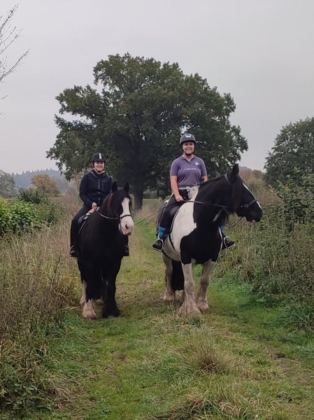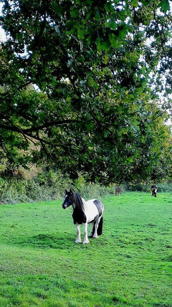 10-year-old Irish Tinker mare, 16.1 hh, registered in the studbook, excellent pedigree. All three gaits are comfortable to ride, solid basic training, ridden bitless and in English style. She has not been worked for a longer period due to personal reasons but is currently in gentle retraining. In the terrain, she has been ridden in company; with calm and loving guidance, she is very cooperative. Loyal character, attentive, she needs a rider who can provide her with security. Halter and farrier familiar, she sometimes tests boundaries – but with calm consistency, very manageable. Healthy and fit, she is currently being treated for mud fever on her lower legs. Strikingly beautiful appearance with a blue eye – a real eye-catcher! Includes accessories: well-fitting saddle (adjusted two years ago), bridle, halter with lead, grooming kit, rugs, and other equipment in good condition. Feel free to contact us with questions or if you're interested! We look forward to meeting you!