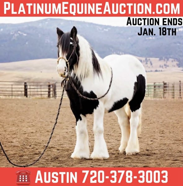 ONLINE AUCTION Place your bids at www.PlatinumEquineAuction.com Starting Bid $3500 Auction ends January 18th, 2026 Need a new saddle? Check out White Rock Saddles on our website or Facebook Lexlin’s Iceland (“Lexi”) – 13-year-old Registered Gypsy Vanner Mare | 14.1–14.2h Lexi is a true all-around Gypsy Vanner built for work and play. Standing 14.1–14.2 hands, she has the temperament, training, and heart to tackle trails, ranch chores, or long days in the saddle. She has a motor, loves covering ground, and can go all day, making her a dependable partner on any ranch. Calm and consistent, Lexi stands like a rock for grooming, bathing, and saddling, and loads into the trailer effortlessly. Big, solid feet and a sturdy build mean she holds up to thousands of miles with ease. Handy, versatile, and easy-going, she’s the kind of mare every barn wants. Under saddle, she offers a smooth walk/trot/canter, rides one-handed, backs easily, and side passes both directions to open gates. Sure-footed and confident over hills, obstacles, and new terrain, Lexi is ready for whatever the day brings. Built to last, talented, and a joy to ride, Lexi is the complete package! Please reach out with any questions or to set up a visit! Located in Winston, MT. Call Austin Grazier 720 378 3003 with any questions. ONLINE AUCTION Place your bids at www.PlatinumEquineAuction.com Starting Bid $3500 Auction ends January 18th, 2026 Need a new saddle? Check out White Rock Saddles on our website or Facebook