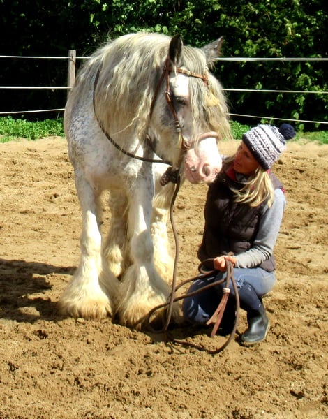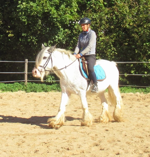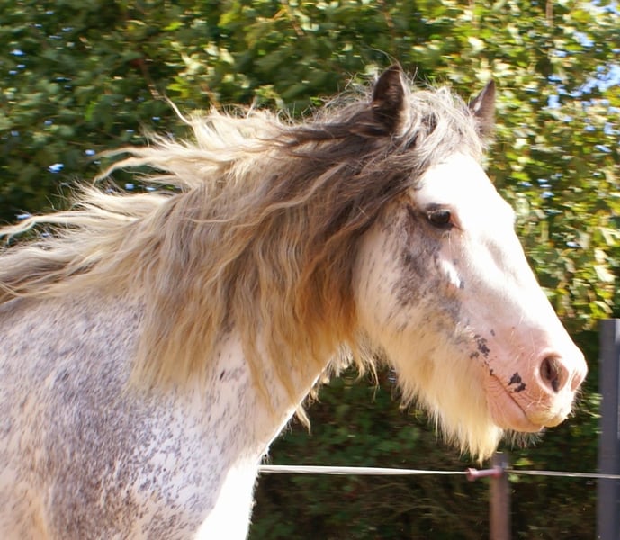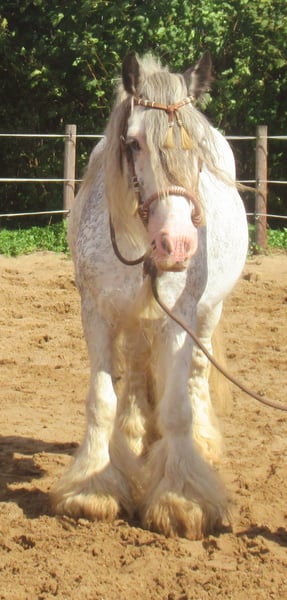 Rijke Tinker merrie in blue blagdon, volledige afstamming, heeft al veulens gehad, momenteel bereden, vriendelijk en aanhankelijk, onbevreesd, kent honden en tractoren, lief voor andere paarden