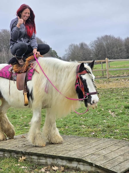 Lovely Tinker mare suitable for therapy, children-friendly, and a reliable leisure horse. Mossy is a sturdy small pony mare. Age: 15 years, born in 2011 Height: approximately 1.46 m (14.1 hh) Price: €4,500 Health certificate: available ✨ Description: This wonderful mare impresses with her balanced, friendly nature and calm demeanor. In daily handling, she is well-behaved, personable, and uncomplicated. Grooming, leading, and general stable routines are easy and pleasant. Under saddle, she is rideable and provides a good riding feel. She is especially calm and reliable in the terrain. She rides relaxed in the field and is suitable for longer hacks. She works motivated on the riding arena. Thanks to her gentle nature, she is an ideal partner for recreational riding. Suitable for: Leisure riders seeking a well-behaved, trail-safe mare. Also suitable for relaxed hacks, light groundwork, and reintegration riders who value an honest horse. Our horses are regularly: – wormed – attended by a blacksmith – osteopathically checked Farm shop: Western saddles, bridles & accessories Transport and equipment can be organized affordably upon request Our service: ✅ 3-month exchange guarantee ✅ Trial ride: €35, each additional horse €25 (credited if purchased on the same day) ✅ €100 immediate discount for pickup or transport on the same day ✅ Personal & honest advice Please contact us exclusively by phone: 0171 – 4001968 Available daily from 8 a.m. to 8 p.m. ⚠️ No emails or WhatsApp messages ⚠️ All information without guarantee