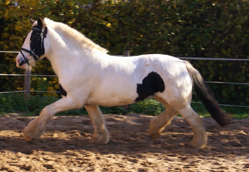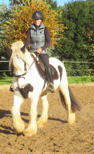 Tinkerstute mit einem blauen Auge, artig im Umgang und beim Reiten, schmiede- und verladefromm, keine Mauke oder Rehe, kennt Hunde und Traktoren, nicht schreckhaft