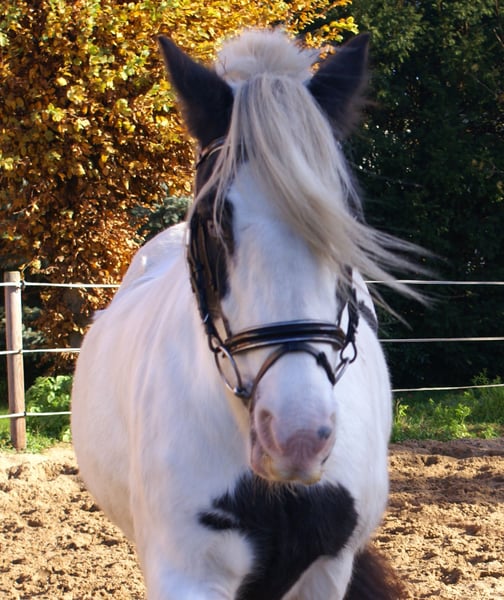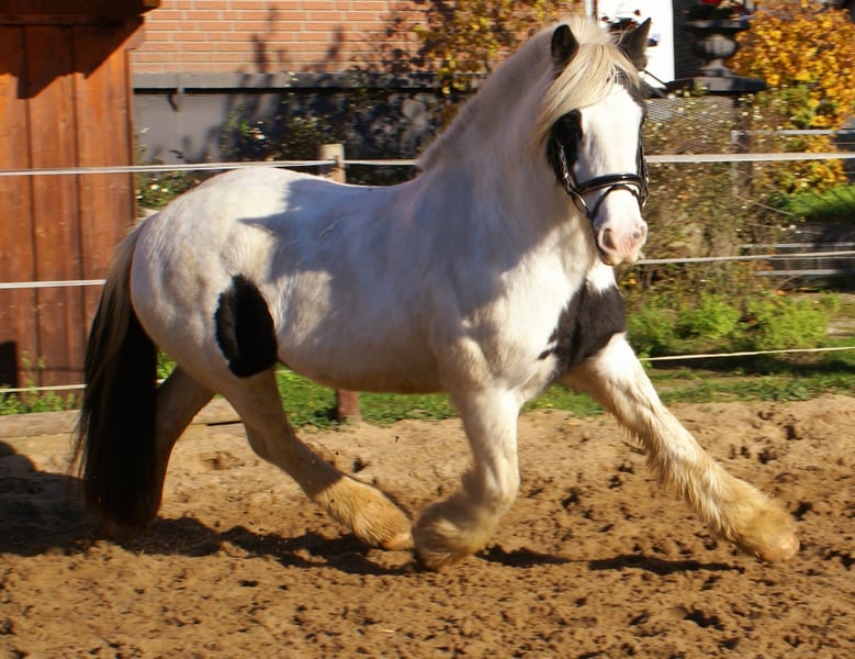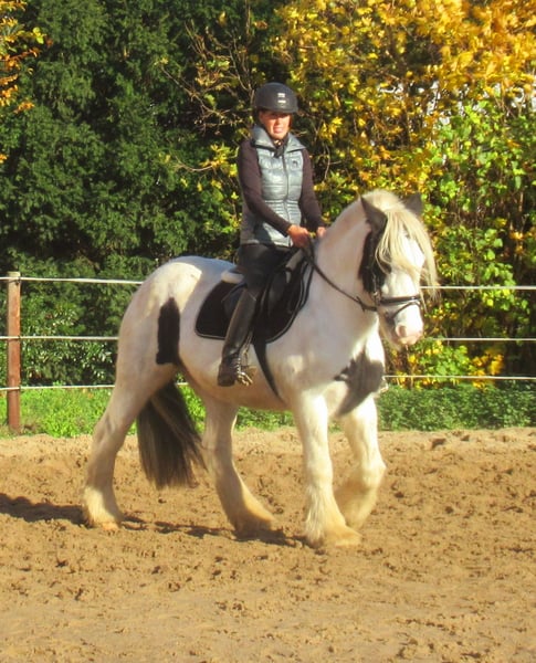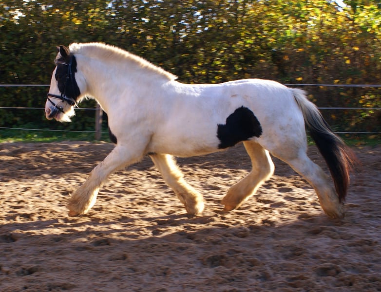 Tolle Rappscheck Tinkerstute, 15 Jahre, 147 cm, mit einem blauen Auge, artig im Umgang und beim Reiten, schön zu reiten, bewegliche sportliche Art, keine Rehe oder Mauke, kennt Hunde und Traktoren, nicht schreckhaft, schmiede- und verladefromm