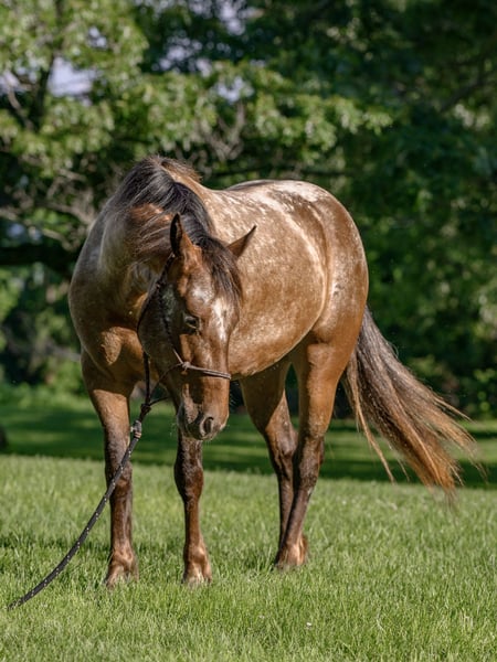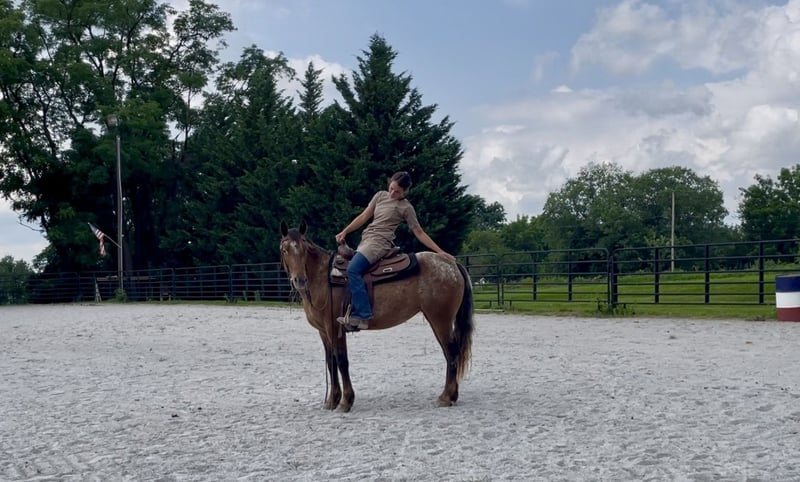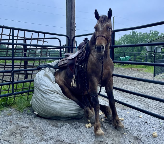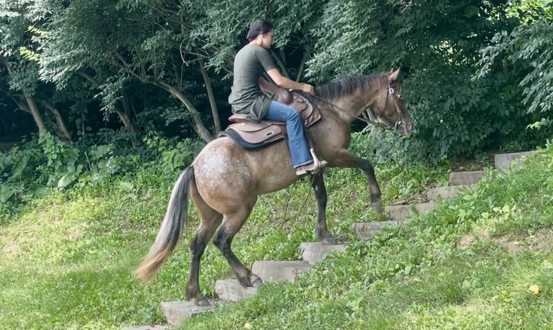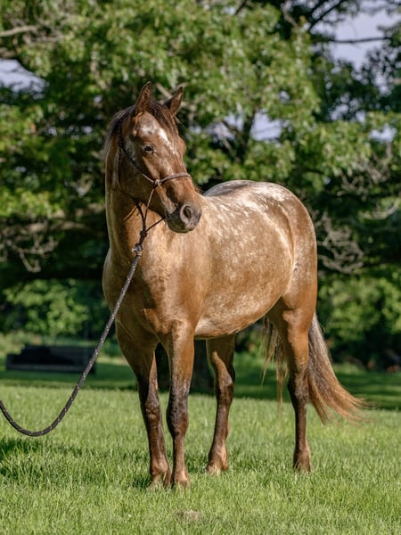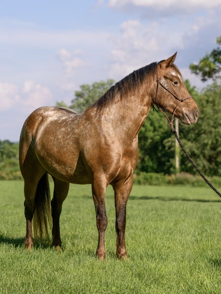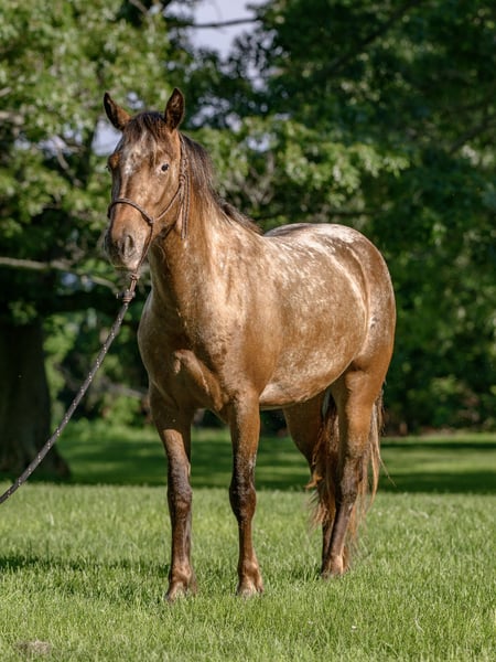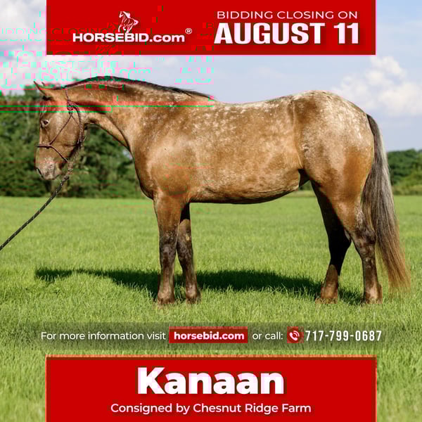 ⚜ The HERITAGE Classic ⚜ Happening now thru MONDAY | AUGUST 11th - Available EXCLUSIVELY on HorseBid's website! For more details and to register visit: www.Horsebid.com CONSIGNOR CONTACT: Chesnut Ridge Farm 717-799-0687 LOCATION: New Holland, PA BREED: Gypsy x Quarter Pony REGISTERED: No REGISTERED NAME: CRF Kanaan COLOR: Bay Appaloosa HEIGHT: 13.3 AGE: 3 GENDER: Mare CRF Kanaan Gypsy x Quarter Pony | Mare | 3 Years Old | 13.2hh DOB: 5/22/22 Color Genetics: Ee, Aa, Lp Sire: San Cler Pearl Wishbone (Gypsy Vanner) Dam: Dual Docs Princess (Quarter Pony) The Ultimate All-Around Youngster Meet CRF Kanaan, a 3-year-old Gypsy/Quarter Pony cross with a one-of-a-kind look and a heart of gold. She’s bold, beautiful, and bred for brains, balance, and versatility. Flashy Appy color, athletic bloodlines, and a rock-solid mind—Kanaan is the full package. *Bred with Purpose, Raised with Heart Kanaan is by San Cler Pearl Wishbone (Gypsy Vanner) and out of Dual Docs Princess, a sweet and athletic Quarter Pony mare who was a beloved part of our family for years. Kanaan is pending registration. Kanaan was raised right—handled daily since birth, given consistent care, and exposed to all the sights and sounds of farm life. From a young age, she was doing obstacle work, tagging along on trail rides, and navigating the world with confidence. She ran through the woods beside her dam and our girls—nothing fazed her then, and it still doesn’t. She’s been exposed to tractors, ATVs, bikes, dogs, kids, and everything in between. Her early experiences built a confident, curious, and adaptable pony who truly enjoys interacting with people and her environment. She loves to play and has a natural desire to learn. Both her parents are athletic, and she’s inherited their movement and mind. *Well-Started and Versatile Under Saddle Now confidently going under saddle in both Western and English, Kanaan is soft in the bridle, picks up both leads with ease, and has balanced, smooth gaits. She’s happy to ride out on the trail or work in the arena, always staying calm, willing, and focused. She meets her rider at their level—gentle and forgiving for beginners (under supervision), but easily steps it up for someone more advanced. She collects, moves off the leg, and carries herself beautifully. *Ground Manners + Fun Personality On the ground, Kanaan is a total gem. She knows fun tricks like sitting down and performing a “come get me” cue—showcasing her trainability and personality. She ties, cross-ties, ground ties, and stands patiently. No kick, bite, or bad habits. She’s been taught to face you when you enter the stall and wait politely until she’s invited to come out. Routine hoof care and deworming have always been kept up-to-date. Easy keeper who keeps her stall organized. Loads, unloads and travels with ease. She is sound and has no past injuries. Currently barefoot. *Herd Savvy and Training-Focused She’s currently in individual turnout to support her training, but she was raised in a well-managed herd and gets along great with other horses. Kanaan is respectful in the pasture and transitions easily between solo and group living. *Why We Love Her (and You Will Too) Kanaan is more than just cute (though let’s be honest—who doesn’t love a flashy Appy pony?). She’s smart, steady, and eager to please. She’s one of those rare youngsters who brings both charm and trainability to the table. With the right rider or family—especially one who can provide consistency, guidance, and fun—she’s going to be a standout partner. Please keep in mind that she is only 3 years old and still in the early stages of her riding career. That said, she has a very kind nature, is responsive, willing, and I do trust her with young riders under appropriate supervision. She’s the type of pony who genuinely tries to please and shows a great attitude toward learning. Like many young horses, she tends to eventually meet her rider at their level—so consistency and confident guidance are important. We recommend having a trainer or experienced adult involved to help her stay on the right path. But don’t let her age scare you—she’s everything we represent her to be: kind, safe, and full of potential. CRF Kanaan is ready to be someone’s best friend, show partner, or next big adventure. Whether you’re looking for a standout in the ring, a trail buddy, or an all-around family pony with a fun personality—she’s ready to go there with you. PPEs are welcome at buyers expense. Contact us with any questions!