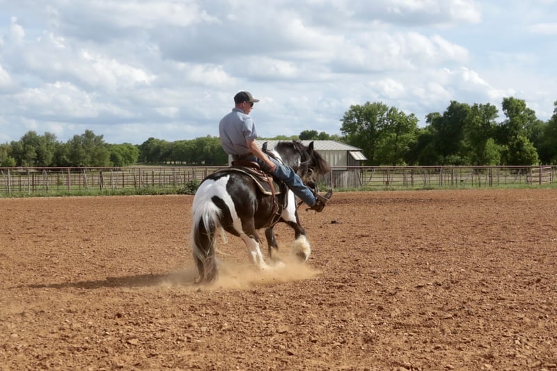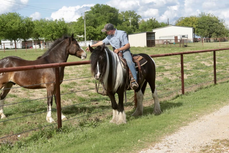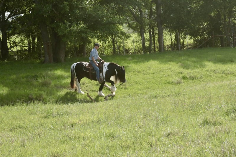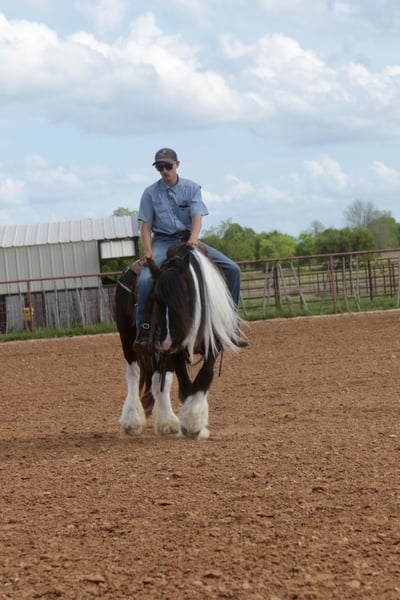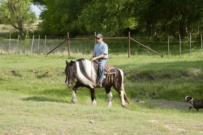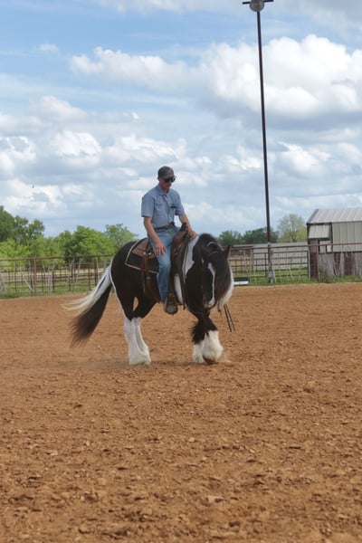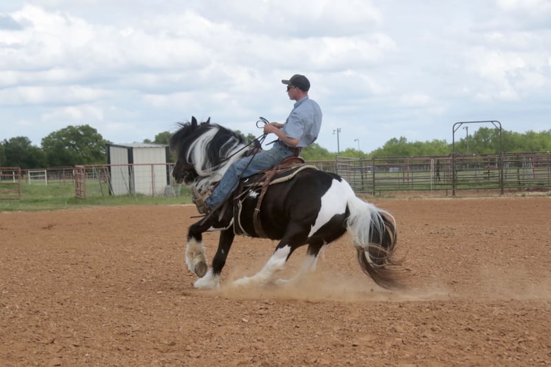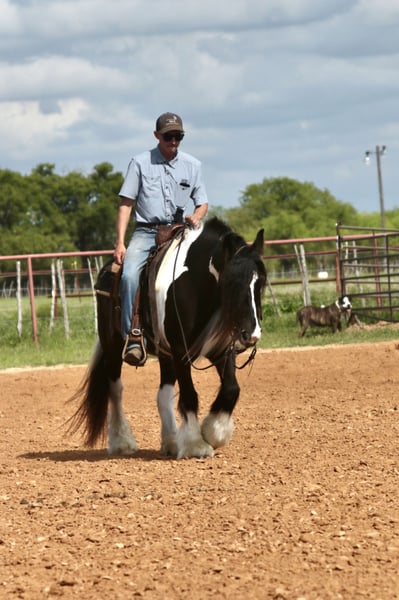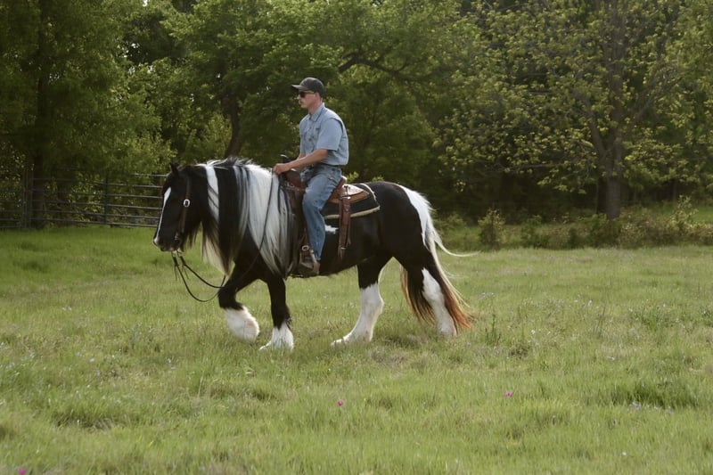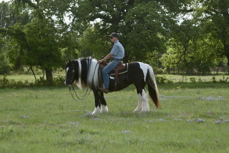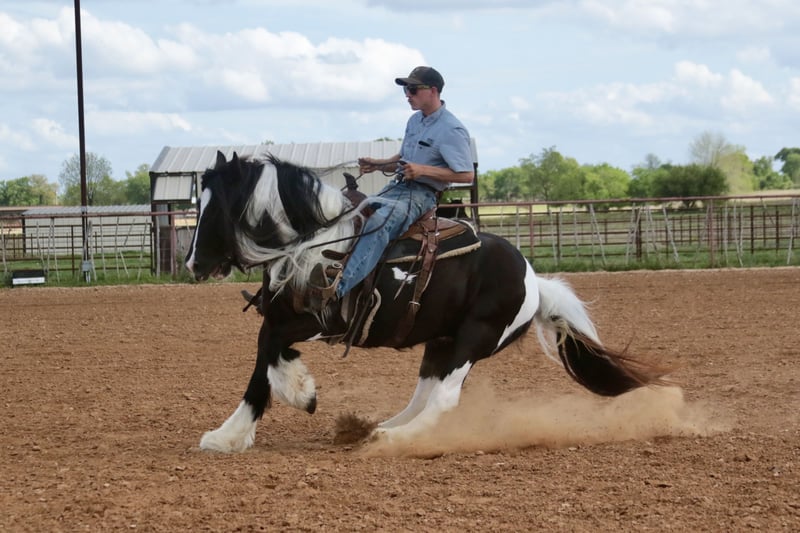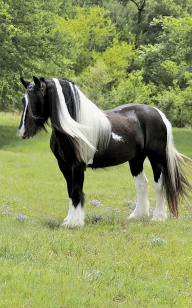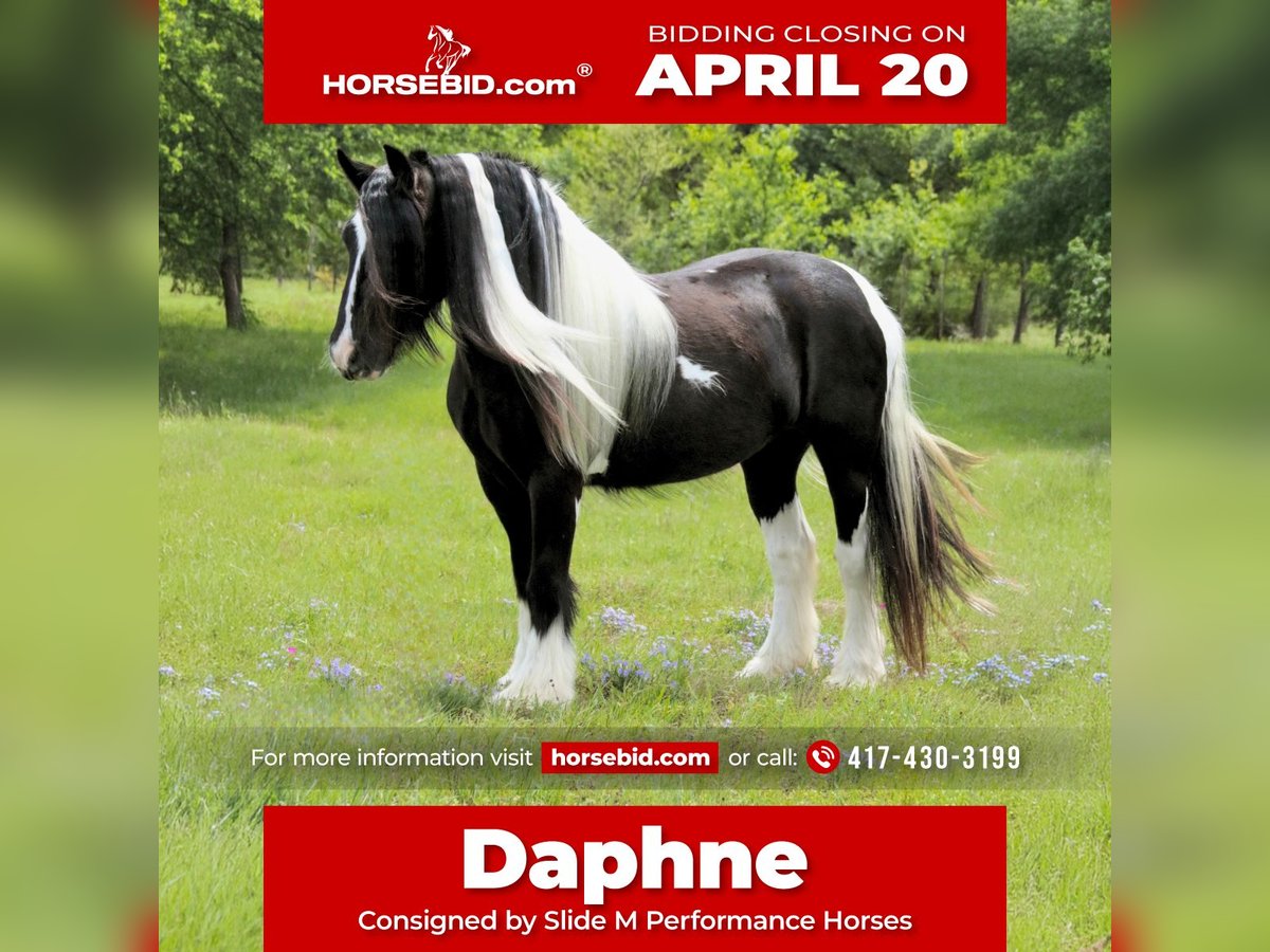 ⚜️𝐭𝐡𝐞 𝓔𝓵𝓲𝓽𝓮 𝐒𝐩𝐫𝐢𝐧𝐠 𝐂𝐥𝐚𝐬𝐬𝐢𝐜⚜️ Happening now thru MONDAY | APRIL 20th - Available EXCLUSIVELY on HorseBid's website! For more details and to register visit: www.Horsebid.com CONSIGNOR CONTACT: Slide M Performance Horses 417-430-3199 LOCATION: Dublin, TX BREED: Gypsy Vanner REGISTERED: No REGISTERED NAME: Daphne COLOR: Black and White Paint HEIGHT: 13.3 AGE: 5 GENDER: Mare Easily the most gentle horse we’ve ever had in our barn, Daphne is our go-to girl when we need something safe and reliable. Daphne is the kind of horse every family wants and needs—truly one for the whole family, from little kids to grandmas. Not only does Daphne have the classic black-and-white coloring, she also has a beautiful, thick mane and tail, along with feathering on her feet for that classic Gypsy Vanner look. This mare has an old soul and the kindest disposition. She meets you at the gate every day, ready for love and attention, and will put her head in the halter for you. Unlike most drafts, Daphne is very respectful on the ground and follows quietly while being led. She matches the pace of a slow handler, always being mindful of your space. Daphne will stand tied like a statue all day long to be brushed, fly-sprayed, saddled, bridled, shod, and bathed. You won’t hear a peep from Daphne, as she is not buddy-sour and not the type to holler for other horses. Daphne will walk out on the trails confidently with a herd or by herself, crossing mud, rivers, creeks, and going up and down steep, rocky hills without a wavering step. She has been trail ridden all over the U.S. She hauls great and doesn’t cause a fuss, loading into an open stock or slant trailer and backing out easily. On top of trail riding, Daphne has been ridden down county roads with passing cars, trucks, trailers, and wildlife, never blinking an eye at anything. Daphne is also a beautiful mover in the arena. She has a steady and controlled walk, trot, and lope, with a smooth stop and a cute turnaround. Daphne rides one- or two-handed and moves off leg pressure. You can also comfortably ride her bareback in a halter if that’s what you desire! This mare is truly the do-it-all type with the demeanor to match. From trail riding to arena work to obstacle patterns, she’s your go-to girl for all things and all ages. She is 100% sound with zero buck, kick, rear, or bite. She has clean, straight legs. PPEs welcome!