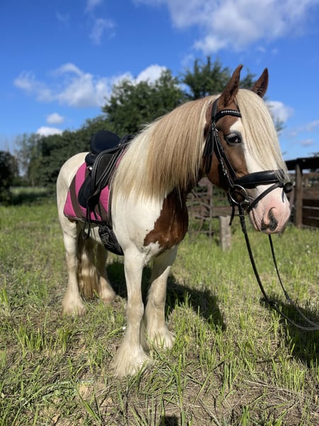 For sale is this beautiful 5-year-old Irish Cob mare with a height of approximately 142 cm. Girl is a picture-perfect Indian mouse, who couldn't be more loyal and charming! She is fine to ride and very relaxed on the way! She has the patience of an angel and nerves of steel! This mare was primarily driven by her previous owners and proved to be bomb-proof even in traffic! She knows how to overcome obstacles and loves trail rides - she has also tackled some cross-country courses and shows great joy in jumping! You can always rely on Girl! During trail rides, she is very calm and fearless! She has a pleasant and steady pace and can be handled by any child! Super cuddly and people-oriented. The absolute dream pony for re-entrants, children/ juniors, riding schools, but also suitable as a therapy pony! She is familiar with riding in groups and has no problem with it - she can go in front, in the middle, or at the back.