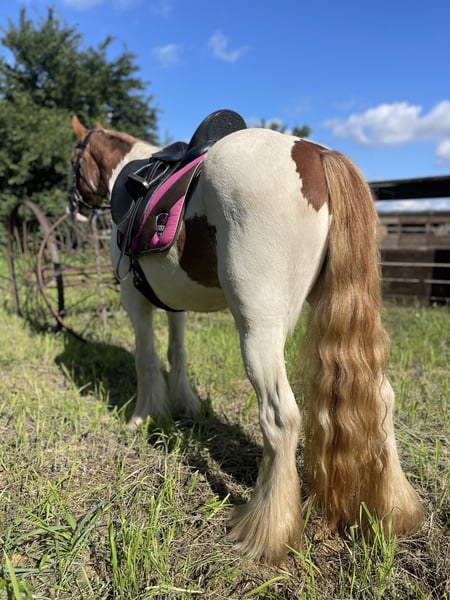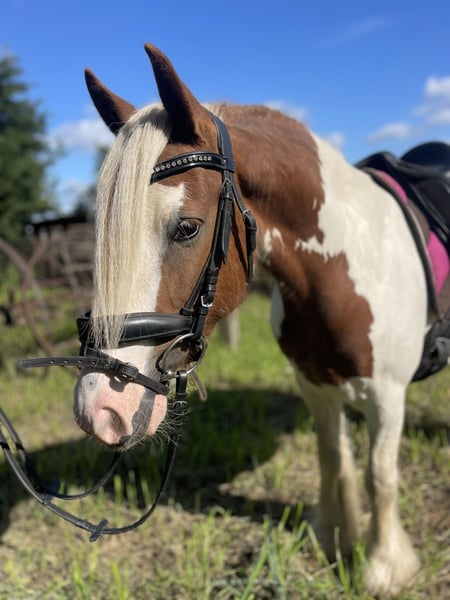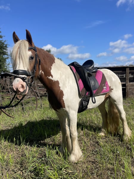 Na sprzedaż jest ta piękna 5-letnia klacz Irish Cob o wzroście około 142 cm. Girl to jak z obrazka przedstawiona Indianer-Maus, która nie może być bardziej lojalna i sympatyczna! Łatwa w jeździe i bardzo zrelaksowana w terenie! Ma anielską cierpliwość i nerwy ze stali! Ta klacz była u poprzednich właścicieli prawie wyłącznie zaprzęgana i tam również pewnie radziła sobie w ruchu drogowym! Zna pokonywanie przeszkód i uwielbia wyjazdy w teren - przeszła również kilka tras terenowych i z radością skacze! Na Girl zawsze można polegać! Podczas wyjazdów w teren jest bardzo odporna na stres i nieustraszona! Ma przyjemne i spokojne GO i jest do opanowania przez każde dziecko! Super przytulna i towarzyska. Absolutny wymarzony kucyk dla osób wracających do jazdy, dzieci/juniorów, szkółek jeździeckich, ale również nadaje się jako kucyk terapeutyczny! Zna jazdę w grupie i nie ma z tym problemu - idzie z przodu, w środku, ale także z tyłu.