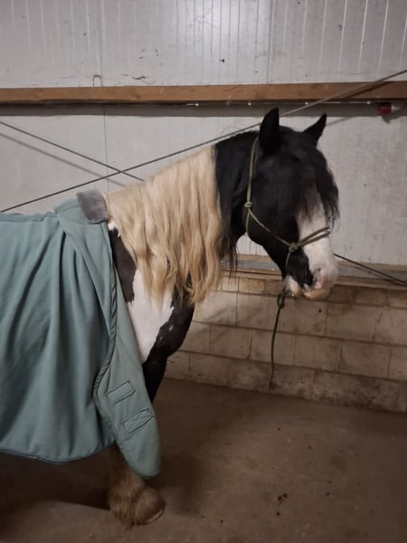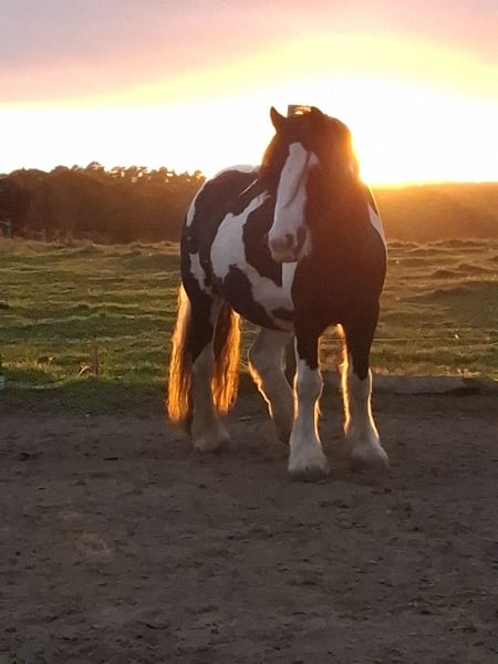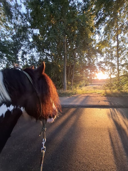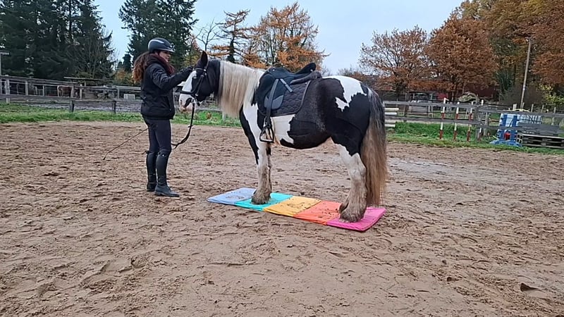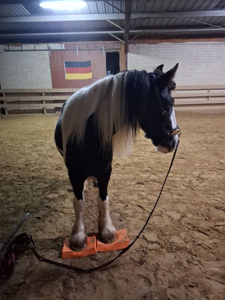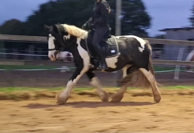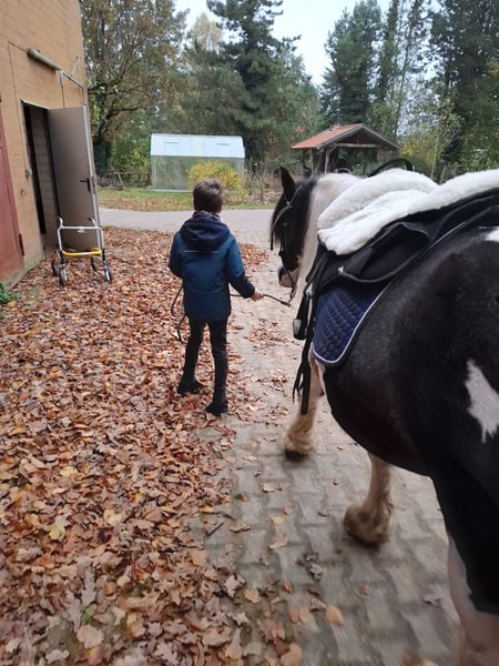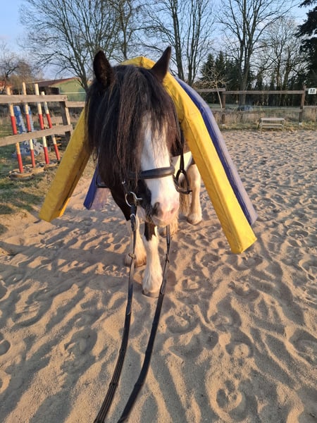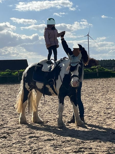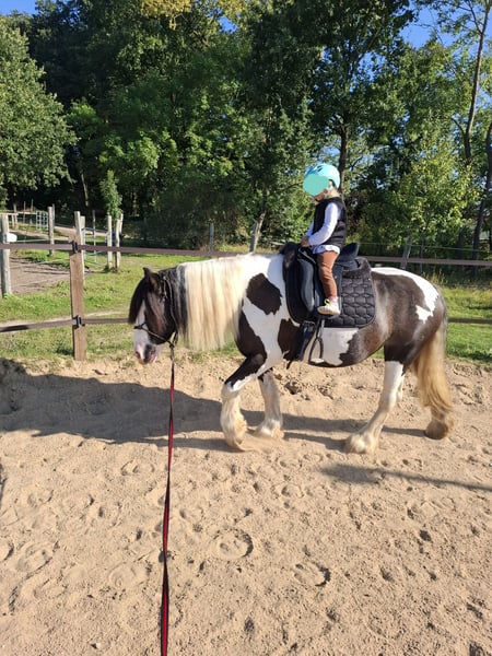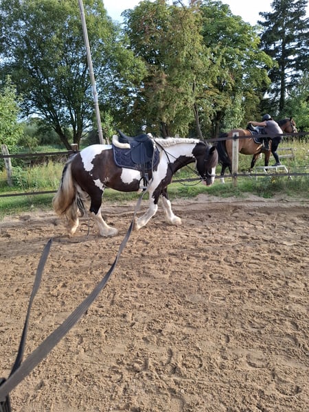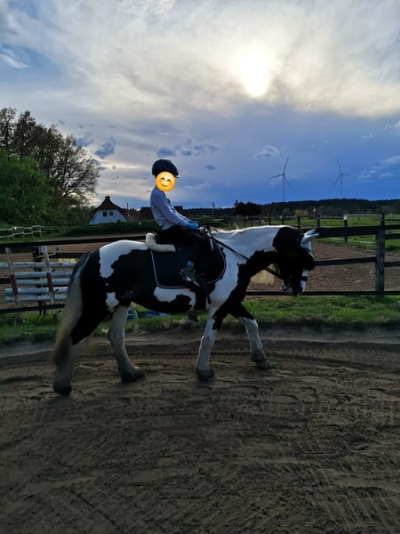 We are offering our wonderful Tinker mare – ideal for dressage and leisure riding. This beautiful Tinker mare was born in 2018 and stands approximately 150 cm tall. She has been trained by us in a gentle and versatile manner and is comfortable riding both in groups and alone in the terrain. She shows talent for dressage. Due to her young age, she is not suitable for beginners or as a children's riding horse at this time and requires a rider who can provide her with confidence. The mare is friendly in handling, well-trained, and demonstrates great talent and willingness to learn. Perfect for riders looking for a horse with a big heart. If you are interested or have further questions, please feel free to contact me. A trial ride is possible for a fee of 35 euros.