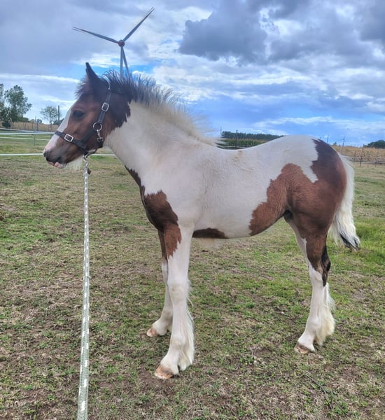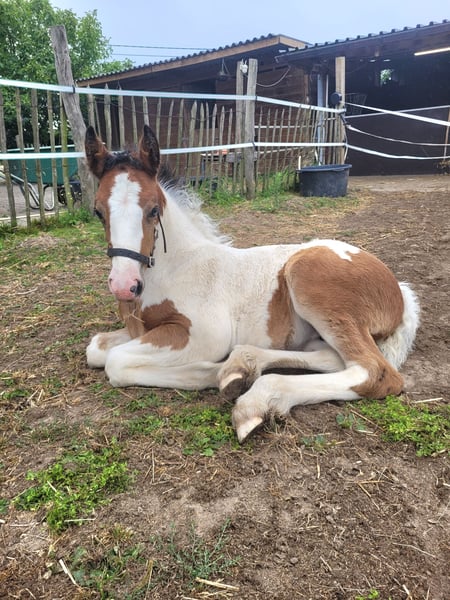 Deze lieve meid mag opzoek naar haar toekomstig 5* huisje! Bella-Rosa is een bruinbonte tinkermerrie. Ze is bij ons geboren op 8 juni 2025. Haar moeder is onze Ice, zij meet 1m50 en haar vader is de goedgekeurde dekhengst Fellow's Captain van de Gorterstraat (laatste foto). Ice en haar veulen werden vorig jaar gekeurd tot 1ste premie en Ice werd ook nog ster merrie en dagkampioen! We wouden ook met Bella naar de keuring gaan, maar deze werd helaas afgelast. Bella is een lief veulen met een leuk karaktertje. Ze kijkt een beetje de kat uit de boom, maar eenmaal ze jou kent krijgt ze geen genoeg van de kriebels en hinnikt ze naar je in de weide. Ze is gewend 24/7 in de weide te staan met haar mama en contact met soortgenoten. Voor nu mag ze nog even genieten bij haar mama en vriendjes op de weide, maar ze mag stilaan opzoek naar haar toekomstig huisje! Bella is voorzien van een chip en paspoort, regelmatig ontwormd en heeft kennis gemaakt met de hoefsmid. Beide ouders testen negatief op pssm1, waardoor ook Bella pssm1 vrij is. Bella-Rosa vd Sterrenhoeve is te bezichtigen in Diepenbeek (Belgisch Limburg). Voor meer info stuur gerust een pb!