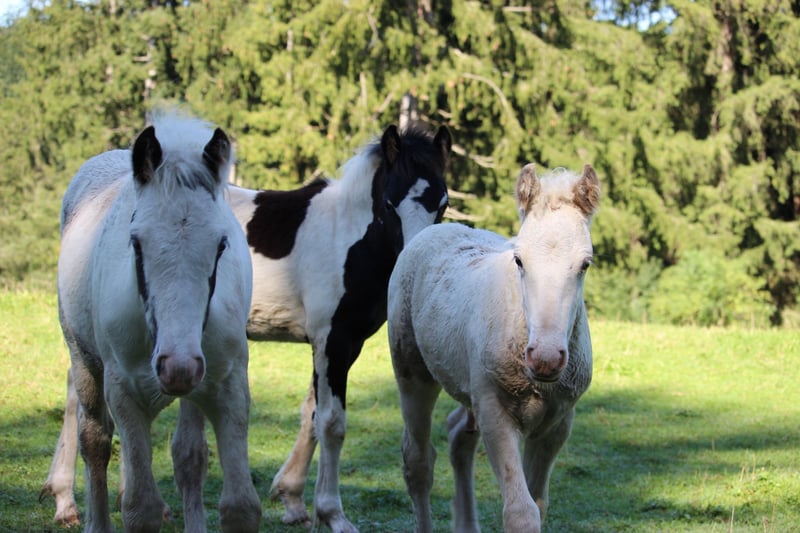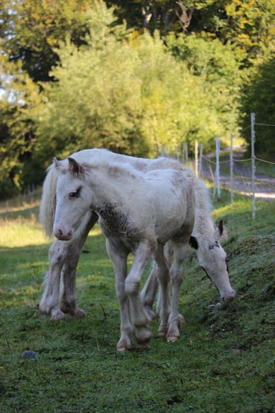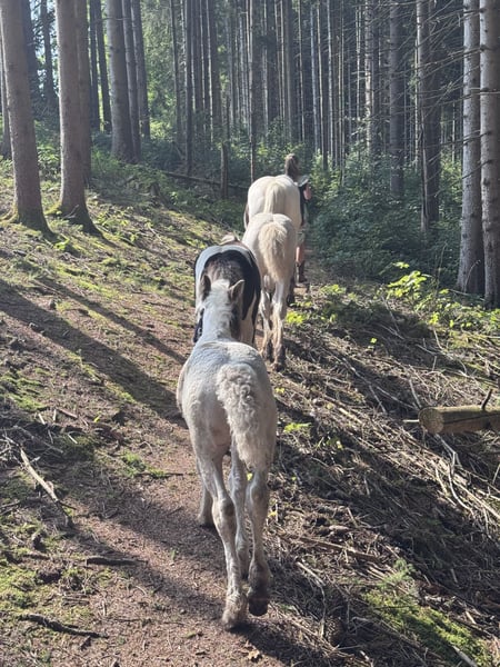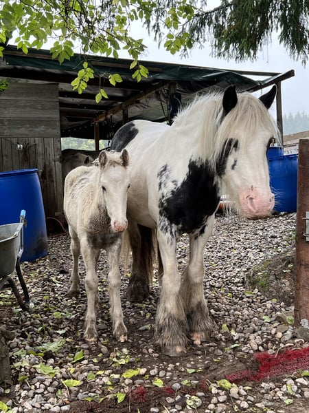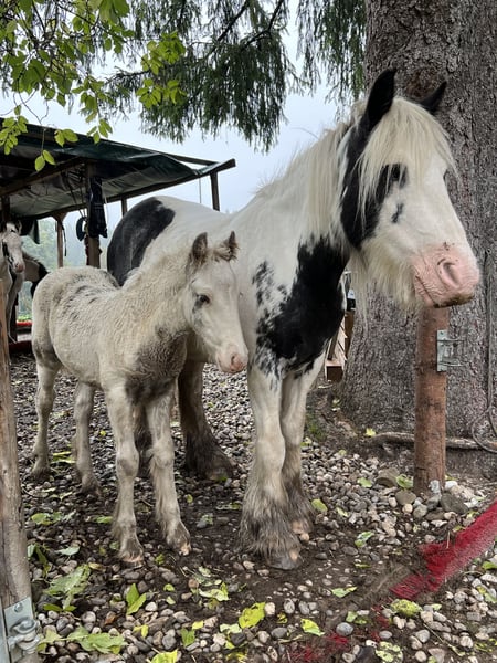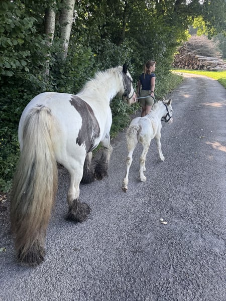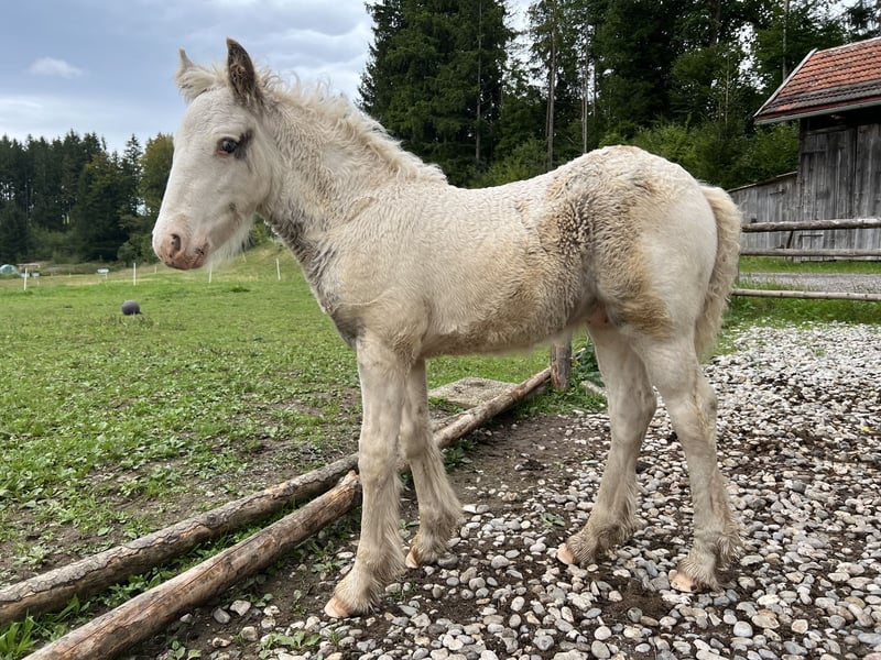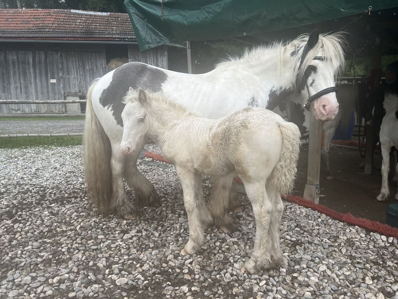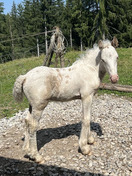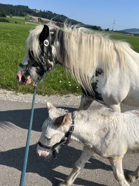 We are selling our beautiful, healthy foal, Charlie. He was born on July 16th, is microchipped, will have a passport at the time of sale, and is regularly dewormed. He is raised in a mixed herd (three mares and one gelding) along with two other foals on a large pasture with an open stable. Charlie is also affectionately called "Prinz Charming" because his warm and friendly nature easily wins everyone over. He has correct conformation, will likely have at least one blue eye, and impresses with his very open, fearless temperament. He is very approachable and friendly with everyone. He will happily join in any fun and, with a height of approximately 136 cm, makes a perfect children's pony as a leisure partner. We are looking for a good home with an open stable management, perhaps initially on a pony pasture, or he can stay for raising, but then he should be gelded around 12 months of age. His mother is a rather athletic and slender Tinker mare (approx. 1.36 m) with plenty of feathering—like his father, a handsome Tinker! The little prince can be sold from December, but as mentioned, it’s also possible for him to stay for raising or to remain with us for a while, allowing Charlie, us, and his new home to get to know each other! You are welcome to spend time with him (preferably multiple times), and if everything fits, anything is possible! What Charlie offers his future owner, among other things, is that he will already know many things by the time he leaves, and he will continue to participate as a lead horse on rides, confidently familiar with road traffic (videos available), everyday noises, and being groomed and led by children—all of which he enjoys! He loves being groomed, easily allows hoof handling, and is introduced to hoof care. I place great importance on regular deworming, especially in the early years. It is very important to me that foals can trust humans and do not have to experience negative encounters, which helps them stay open-minded and gives them the best start I wish for them. For more pictures and videos, please feel free to contact me!