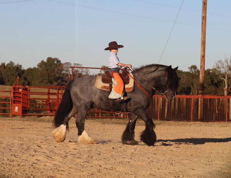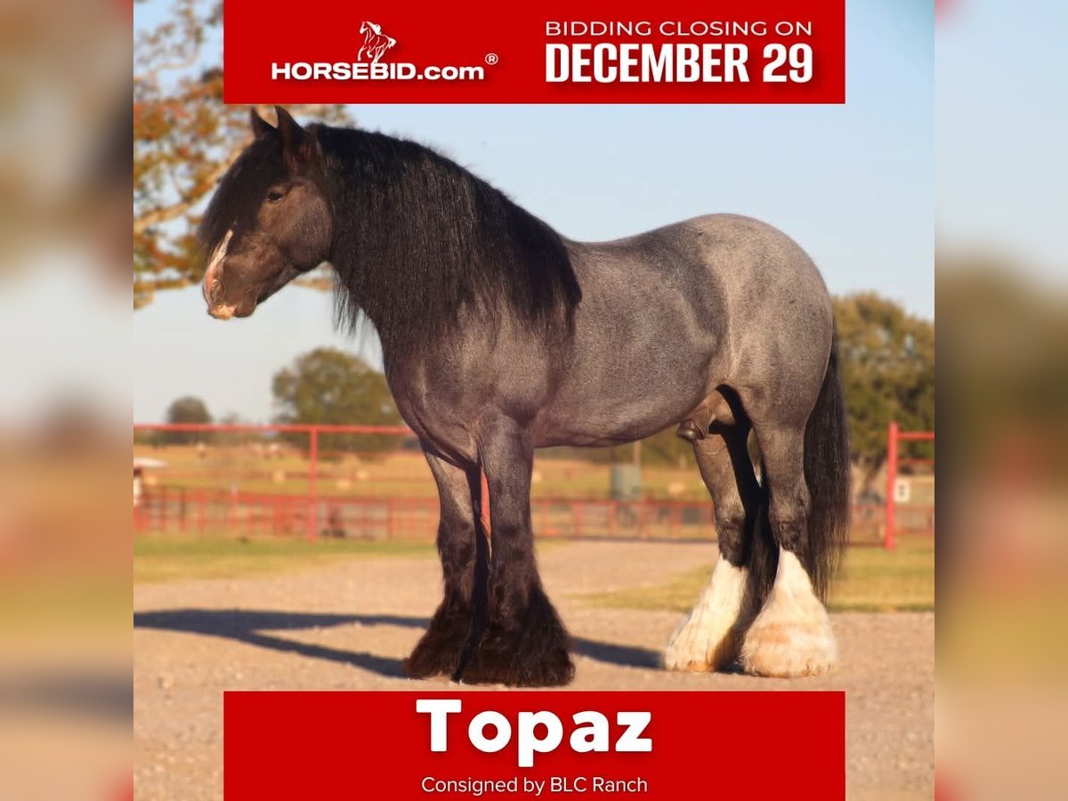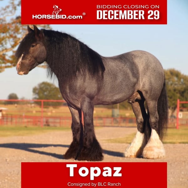 ⚜️ 𝓗𝓮𝓻𝓲𝓽𝓪𝓰𝓮 𝐖𝐢𝐧𝐭𝐞𝐫 𝓒𝓵𝓪𝓼𝓼𝓲𝓬⚜️ Happening now thru MONDAY | DECEMBER 29th - Available EXCLUSIVELY on HorseBid's website! For more details and to register visit: www.Horsebid.com CONSIGNOR CONTACT: BLC RANCH 972-249-5425 LOCATION: Grand Saline, TX BREED: Gypsy REGISTERED: Yes REGISTERED NAME: Topaz COLOR: Blue roan HEIGHT: 14.3 AGE: 6 GENDER: Stallion Meet Topaz Topaz is an exceptional Stallion that impresses and turns heads everywhere he goes. Registered GVHS (Gypsy Vanner Horse Society) AND IGEA (International Gypsy Equine Asso) Standing … with his beautiful blue roan color and matching white socks you won’t find another like him. His demeanor and personality makes him a favorite for everyone. Topaz has been there and done it all. Not only is he trained to lay down and sit on command like a dog he has had extensive saddle and driving training making him as versatile as they come. I guarantee you, you will not ride a smoother gypsy. His gate is impeccable making his ride as smooth as a rocking chair with his one foot cue right into a lope ending with a whoa stop. Topaz knows both of his leads , responds to leg cues , pivots both directions like a quarter horse and has a great stop. When we say he has been there and done it all we mean it. From carrying an extremely large flag in parades , to placing in obstacle course challenges against top quarter horses , to driving to town , going through water, carrying our children and more he has done it all and with ease. While he may not be for everyone. He has been hauled , stalled next to and ridden with mares and is always on his best behavior. The possibilities with Topaz are endless. Make him your number one ride and Breeder Stallion. Just like his name Northern Lights Topaz Gemstone he truly is a gem that will be a great addition for anyone. Sound and Sane - Negative for PSSM1/FIS Current on farrier , deworming , coggins and will come with health cert.