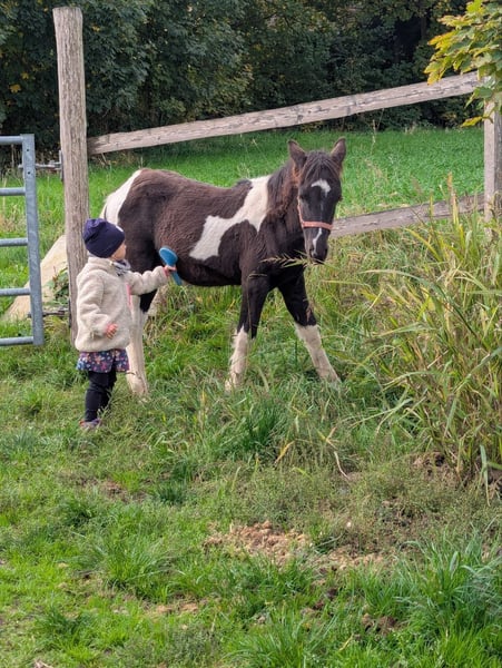 Absolut Platz vor Preis! Wir verkaufen unseren Rocky, geboren 17.6.25 Mama ist eine tolle Quater Haflinger Stute die bei uns in der Pädagogik eingesetzt wird. Papa ist ein großer Tinker. Rocky und seine Mama kamen vom Gardasee zu uns als er ein paar Wochen alt war. Rocky ist ein lustiger Frechdachs , unglaublich intelligent und dem Menschen zugewandt. Er spielt sehr gerne mit seiner Shetty Freundin, die älteren Pferde lässt er (meistens) brav in Ruhe und ordnet sich unter. Er lebt in einer kleinen Herde im Offenstall. Absolut brav beim Hufe kratzen, putzen, abduschen und bei Spaziergängen. Rocky lernt sehr schnell, nach ein bis zweimal üben kann er neue Aufgaben und möchte gefallen. Er kennt Kinder jeden Alters, Hunde,Hühner, Fahrzeuge, laufen bei Dunkelheit,... Er ist absolut unerschrocken, neugierig und dabei menschenbezogen. Er braucht klare Ansagen und natürlich weiterhin eine gute Ausbildung dann wird er ein perfekter Partner. Er ist jetzt schon ca 115cm groß wird also sicherlich größer als seine Mama mit 140cm Bei ehrlichem Interesse freuen wir uns über Kontakt und einen Besuch bei uns. Videos sind auf Anfrage gerne zu bekommen.