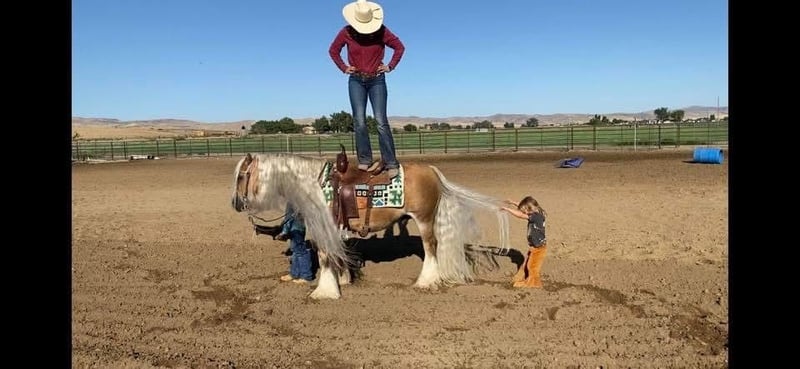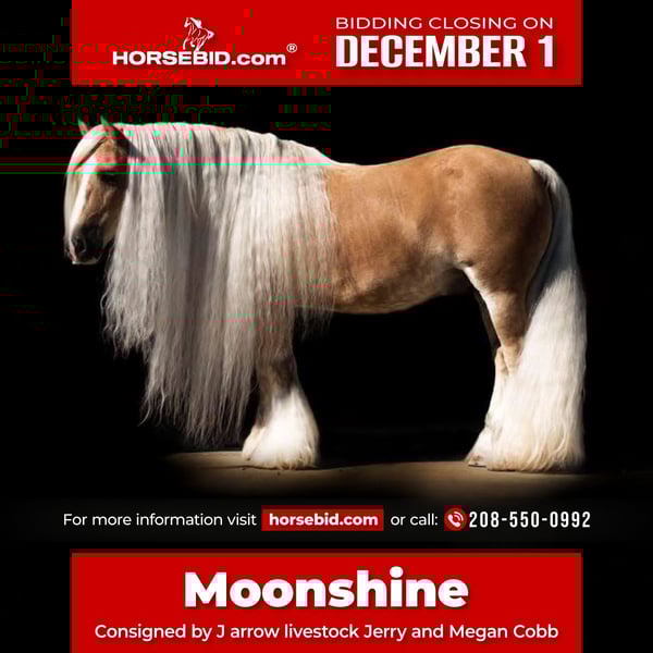⚜️ 𝓽𝓱𝓮 𝐇𝐨𝐫𝐬𝐞𝐦𝐚𝐧'𝐬 𝓢𝓱𝓸𝔀𝓬𝓪𝓼𝓮⚜️ Happening now thru MONDAY | DECEMBER 1st - Available EXCLUSIVELY on HorseBid's website! For more details and to register visit: www.Horsebid.com CONSIGNOR CONTACT: J Arrow Livestock Jerry and Megan Cobb 208-550-0992 LOCATION: Caldwell ID BREED: Gypsy REGISTERED: Yes REGISTERED NAME: Cloneen Honey of Lexlen COLOR: Palomino HEIGHT: 14 AGE: 15 GENDER: Gelding Moonshine is a dream horse. Extremely trained in the arena, on the trails, on the ranch, for kids, and to drive. He has been in weddings and in parades. He is always a true gentleman. He’s the one you want too catch and mess with everyday. He will put a smile on your face with his amazing disposition and willing demeanor. Moonshine has seen lots of trail miles in many different types of terrain from the Arizona dessert to the mountains of Idaho. He will cross obstacles of any kind out on the trail, great crossing water and over logs as well as steep rocky terrain. Moonshine is a dream to drive. Anyone can drive him, great down busy streets or country roads he is so fun. 100% kid safe, our kids love him they both ride him here on our ranch and get along great with moonshine. Super uncomplicated horse that will allow you too turn him out for long periods of time and come back the same broke horse. Moonshine is the coolest in the spotlight he loves the rodeos he’s been used in as a grand entry horse packing the greatest flag on earth. Always stays calm and confident. If you are looking for a real life unicorn, moonshine is just that! Disclosure moonshines mane is a bit shorter than the black and white photo “ the grass was greener on the other side of the fence” but it is till very long current pics also shown. Please call Jerry at 208-550-0992 for more information.