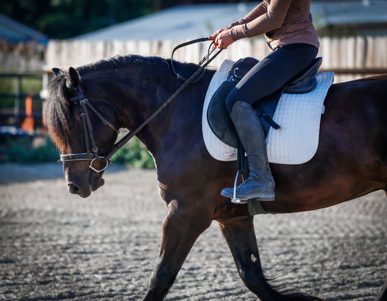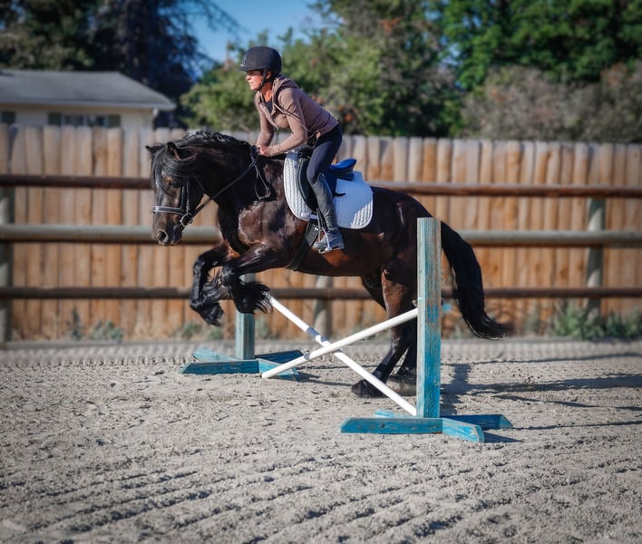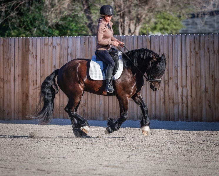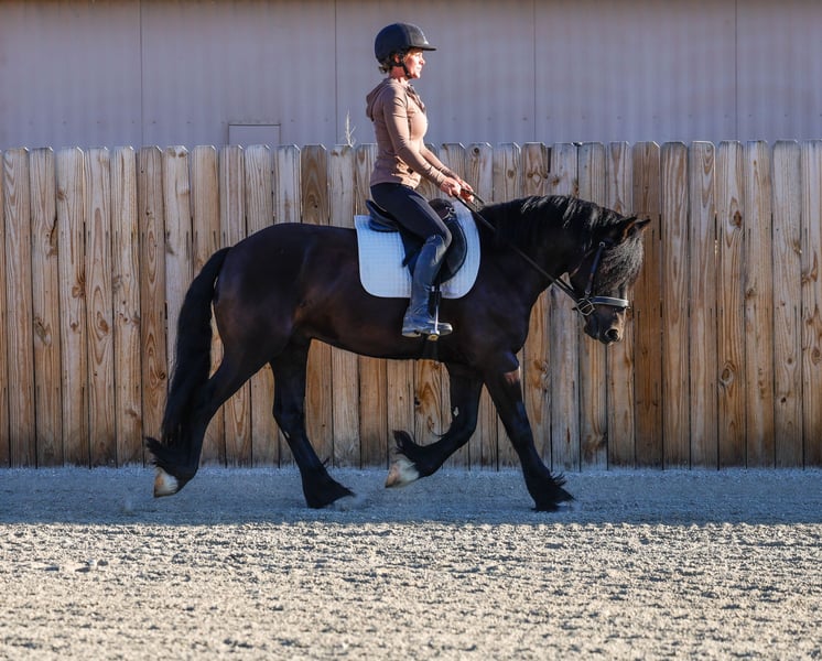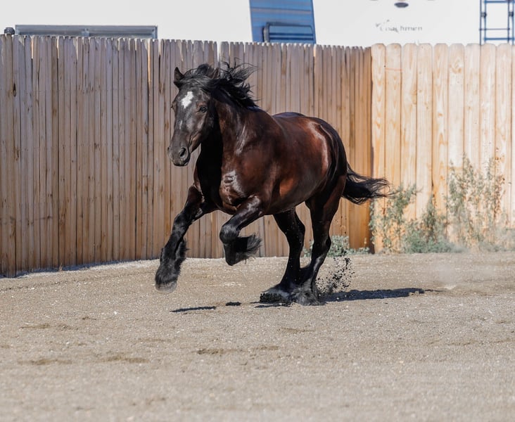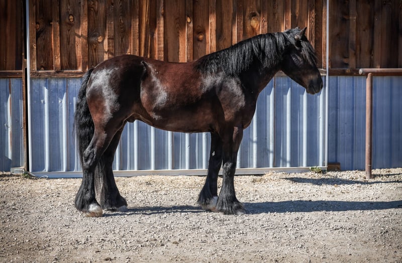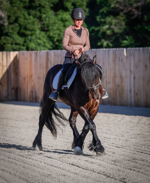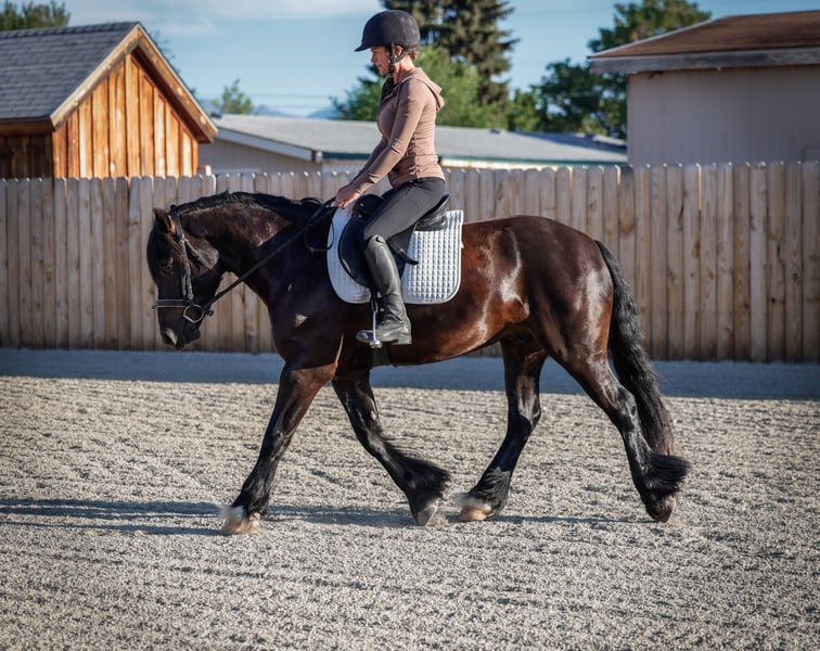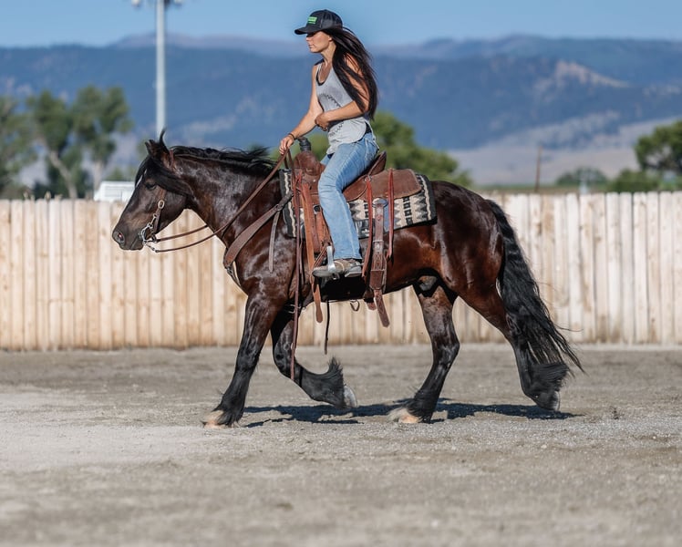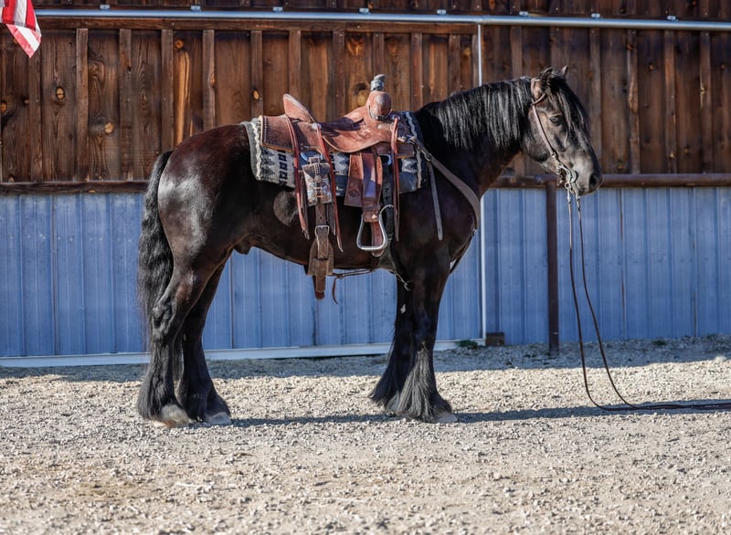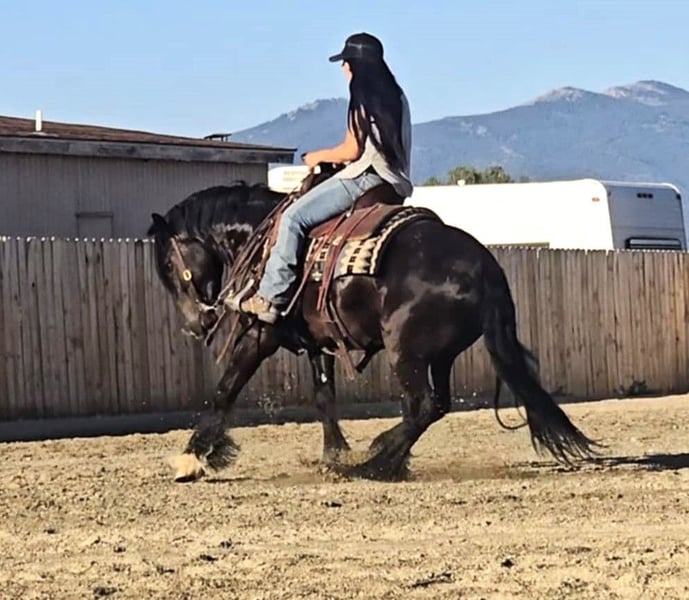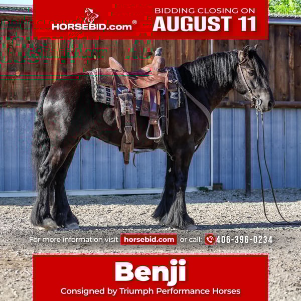 ⚜ The HERITAGE Classic ⚜ Happening now thru MONDAY | AUGUST 11th - Available EXCLUSIVELY on HorseBid's website! For more details and to register visit: www.Horsebid.com CONSIGNOR CONTACT: Triumph Performance Horses 406-396-0234 LOCATION: Hamilton, MT BREED: Gypsy Vanner x Fell Pony REGISTERED: Yes REGISTERED NAME: Sir Benjamin COLOR: Black HEIGHT: 14.1 AGE: 4 GENDER: Gelding 🖤 Feathered & Fancy - Jet-Black And Full of Charm SIR BENJAMIN - 2021 double registered Gypsy Vanner x Fell Pony Gelding | 14.1 hh | Black 📍 Located in Hamilton, MT 💻 For more information call Bridgett anytime @ (406) 396-0234 If you’re looking for the perfect mix of regal presence and adorable charm, meet Benji! This gorgeous gelding is the best of two worlds: his sire is the renowned RALFLAND RANGER, a UK Fell Pony stallion celebrated for his sturdy bone, sure-footedness, and work ethic, while his dam MISHTO was imported directly from the UK, bringing the signature Gypsy Vanner feather, elegance, and gentle mind. The result? A jet-black, thick-made, fancy-moving gelding with class to spare and enough personality to keep you laughing. Under saddle, Benji is fancy broke. He’s light and responsive, has a lovely one-handed neck rein, has smooth, correct turnarounds, and beautiful walk-to-lope transitions. He’ll plant his hind end for a nice stop, move easily off leg, and side pass with ease. He’s the kind that tries to get it right every time—because pleasing his rider is his goal. Athletic for the breed and balanced in every gait, he’s as nice to ride as he is to look at. Benji isn’t just an arena horse, either. He’s seen and done a little bit of everything and take to new jobs with a willing attitude. He’s done all aspects of ranch work including working cattle in big country, gathering pairs, doctoring in the pasture, drug calves to the fire during branding, and crossed rough terrain. He’s tracked the roping sled, has started some breakaway and heeling, lopes through the barrels and poles, gone over jumps, and even tried his hand at mounted shooting. Out on the trail, he’ll cross water, push through brush, and go anywhere you point him. Western, English, bareback—Benji doesn’t care. On the ground, he’s as sweet and uncomplicated as they come. He loves people, meets you at the gate, stands quietly to saddle and bridle, and trailers great. He gets along with the herd, has great feet that can stay barefoot, and stands like a pro for the farrier. He’s blemish-free aside from a couple of old cosmetic splints and is 100% sound. Benji is best suited for a more experienced rider as he appreciates a slower warm-up, if not, when you first trot or lope off, he can occasionally be a little humpy until he’s loosened up. He’s not mean and has zero intent to buck you off—he’s just young, sensitive, and still maturing. Once he’s warmed up, he rides off soft and quiet, and we fully expect this to disappear as he matures. He’s even been ridden by younger kids after being warmed up by an adult and takes excellent care of them, which speaks volumes about his honest nature and kind heart. Benji is the whole package: bred right, trained right, and as sweet as can be. With his jet-black coat, soft eye, flowing feather, and fancy conformation, Benji is as cute as they come, but don’t let the good looks fool you—he’s a hard worker with the handle and foundation to go in just about any direction you want. Whether you see him as your next ranch partner, trail horse deluxe, English extraordinaire, or future kid’s best friend, he’s got the brain, ability, and personality to make it happen. If you’ve been looking for that rare mix of athleticism, good mind, and charm in a stunning black, feathered package, Benji is ready to meet you at the gate and trot straight into your heart.