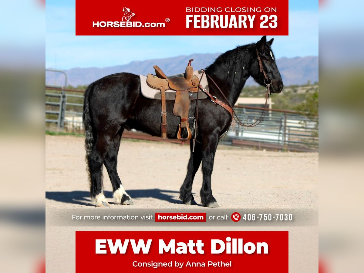 💎 𝐓𝐇𝐄 𝓓𝓲𝓪𝓶𝓸𝓷𝓭 𝐒𝐇𝐎𝐖𝐂𝐀𝐒𝐄 💎 Happening now thru MONDAY | FEBRUARY 23rd - Available EXCLUSIVELY on HorseBid's website! For more details and to register visit: www.Horsebid.com CONSIGNOR CONTACT: Anna Pethel 406-750-7030 LOCATION: Wickenburg, AZ BREED: Gypsy Vanner Cross REGISTERED: Yes REGISTERED NAME: EWW MATT DILLON COLOR: Black HEIGHT: 15 AGE: 4 GENDER: Gelding Eww Matt Dillon Bonanza is a coming 4 year old Gypsy Gelding. He has been ridden consistently the past 6 months. Walk, trot, lope, stop, side pass, has a nice turn around. Bonanza is a beautiful mover and trots out effortlessly. He has an incredibly smooth lope. He is not your typical lazy gypsy. He loves having a job. He has the energy to go all day and would make a great ranch horse or winter project for someone. He has been ridden in the arena, down the road with traffic, down the trail, in the mountains, and out in the desert. Bonanza has been through water, drug a log, trotted ground poles and even gone through the barrels and poles. Bonanza has even been used to sort cows out on the ranch. He loads and unloads in and out of the trailer. Has been hauled 1000s of miles and handled it well. He eats and drinks on the road like a champ. He is still young. He lacks confidence and is a more sensitive horse. He is not a kids horse. He is best suited for an experienced rider and someone who can work with him consistently. He gets better everyday and wants to please. We have loved having Bonanza and his goofy personality. We hope he can find a loving, forever home. Please reach out with any further questions or to schedule a time to come check him out. He is currently located in Wickenburg, AZ.