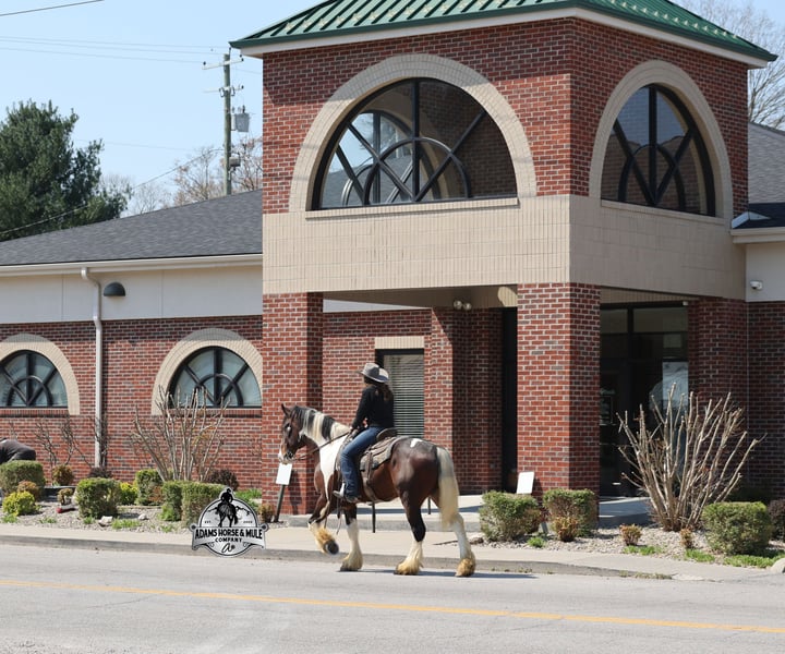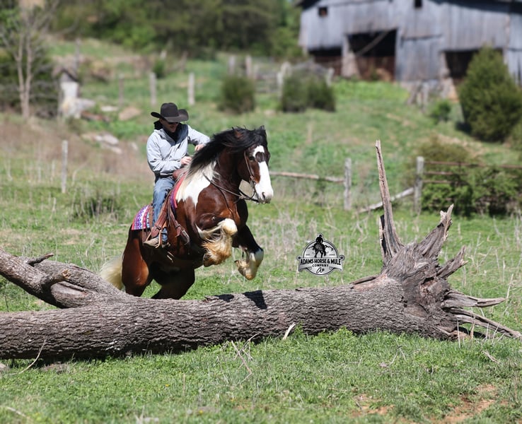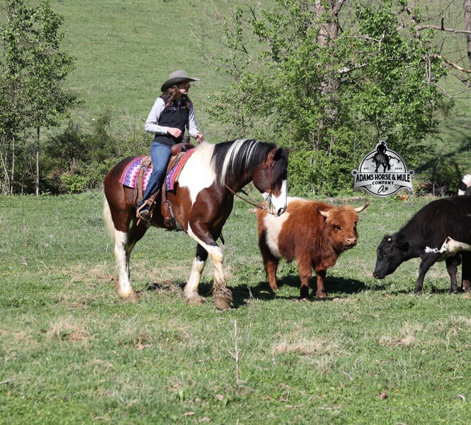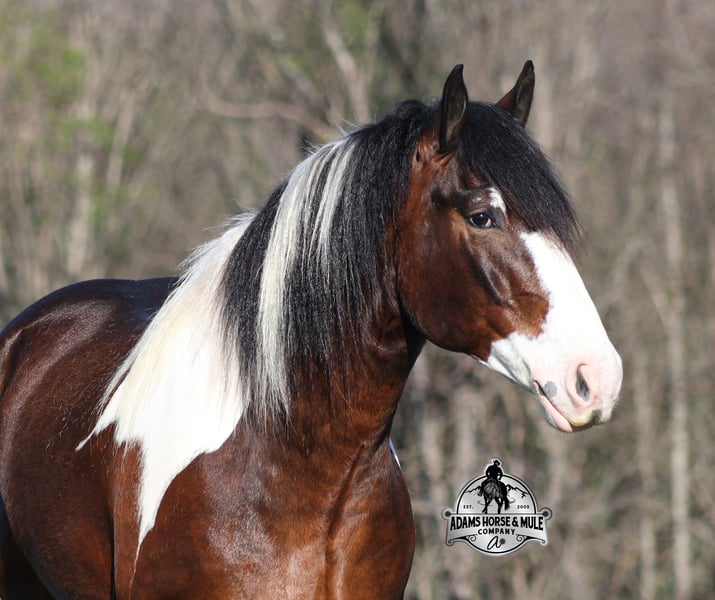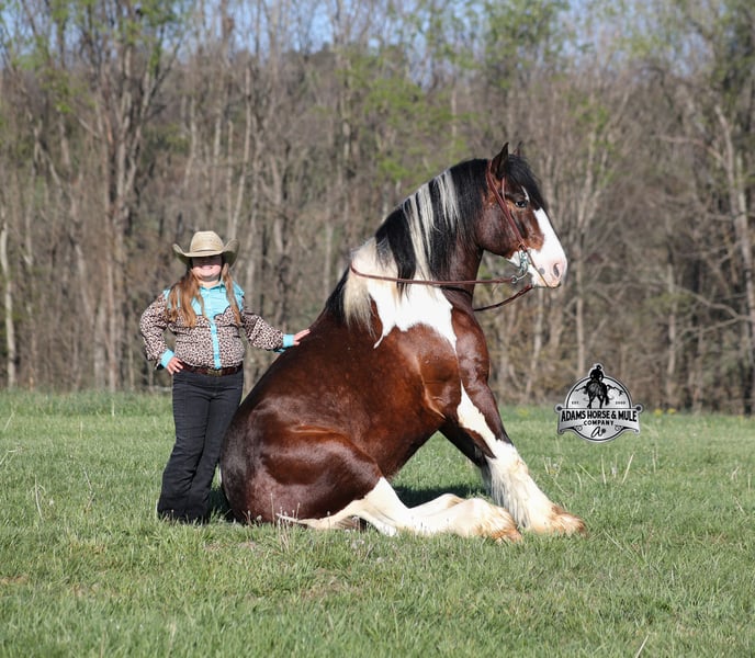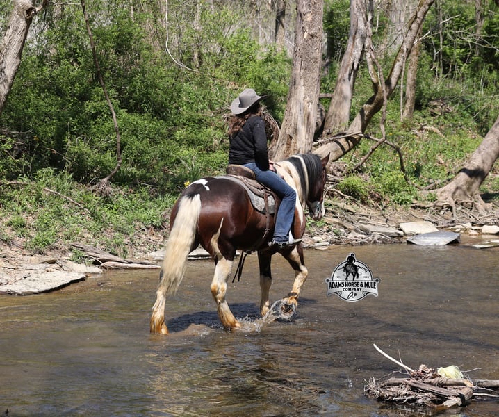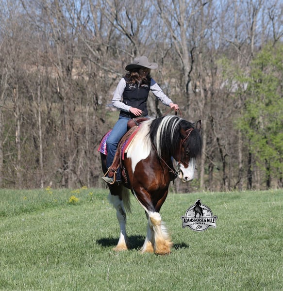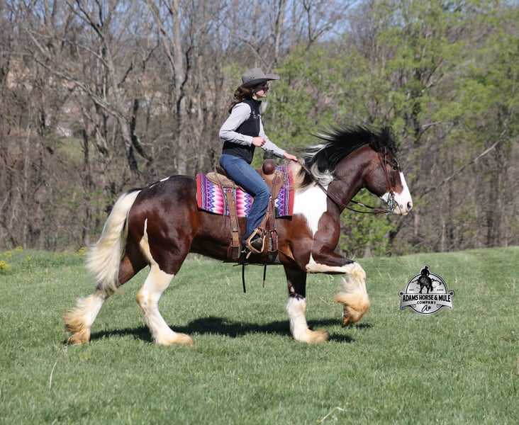 2 week Guarantee- Go to visit our website for more pics and video link at www.AdamsHorseAndMuleCo.com AHAMC has been in the horse business and sold horses over the internet since 2005. We have a long track record of success with hundreds of happy customers. We work hard to match riders with the correct horses and specialize in beginner safe, family friendly horses that have been used and checked out by our family! We can set up transportation anywhere in the US and look forward to working with you. Take a Chantz and find the love of our life! This beautiful bay tobiano gypsy draftcross that stands around 16.1hh, that will weigh around 1450lbs and he is a 6 years old is no chance at all! He is 100% the real deal in every aspect. Chantz has been through the natural horsemanship program and knows some tricks such as to lay down on command and he sets like a dog. Chantz is going to build your confidence as he will take care of all sizes and ages of riders. They don’t get too young or too old for this guy, he will take the best of care of his rider in all situations! He is well broke in the bridle, he lopes nice circles, has a smooth jog, stops on a dime and reins around really well. He has been ridden down the highways and he is traffic safe. He is broke to work under harness in all types of wagons and farm machinery, single, double or quad. Chantz is great on trails and he will cross creeks, ditches, logs and navigate rough rocky areas. He has been ridden at night on coon hunts, had guns shot off of his back and led dogs. He has been exposed to all kinds of wildlife such as deer or turkey or other animals like cows or dogs and will go anywhere that he is asked too. He has been ridden many miles in the mountains of Eastern Kentucky and encountered every obstacle possible on the trail. He will go up or down even the steepest slopes, across deep creeks, over downed trees, and over all types of rough terrain while still being sure footed. Chantz has been used to pen cattle at the stockyards, has worked on the ranch and in the branding pen. Chantz is the PERFECT addition to any family as he is just a big puppy at heart!!! Feel free to call Eric 606-308-2461 with any questions.