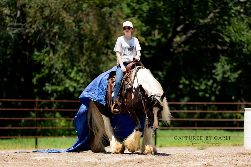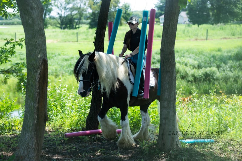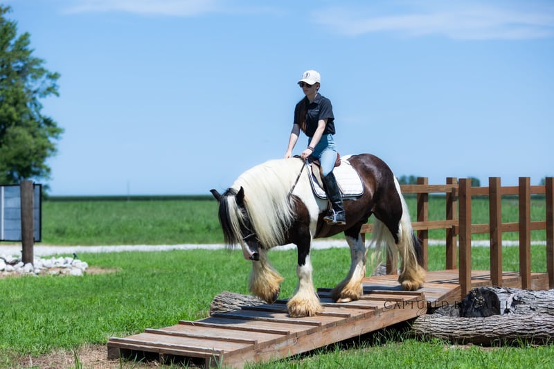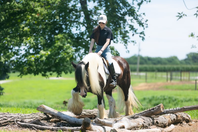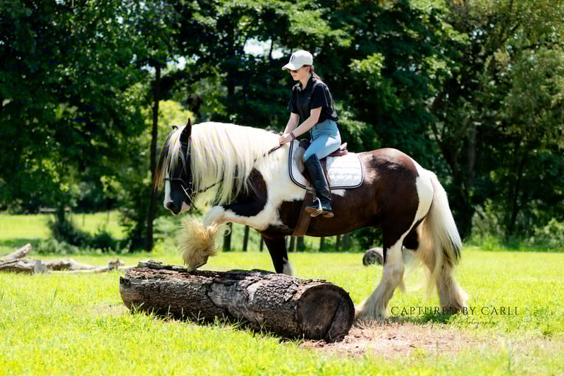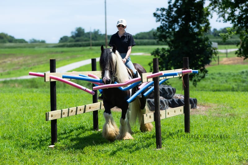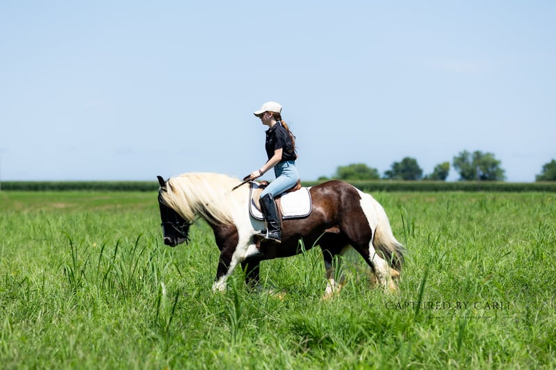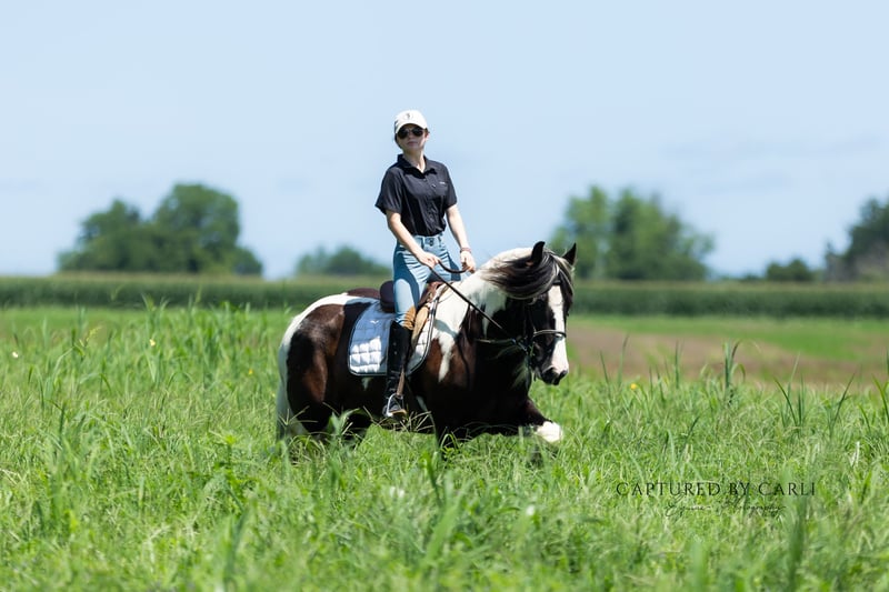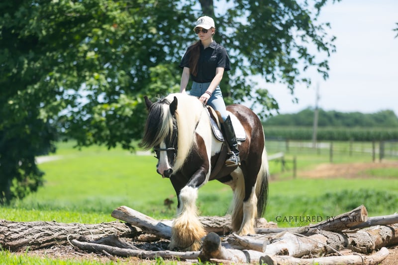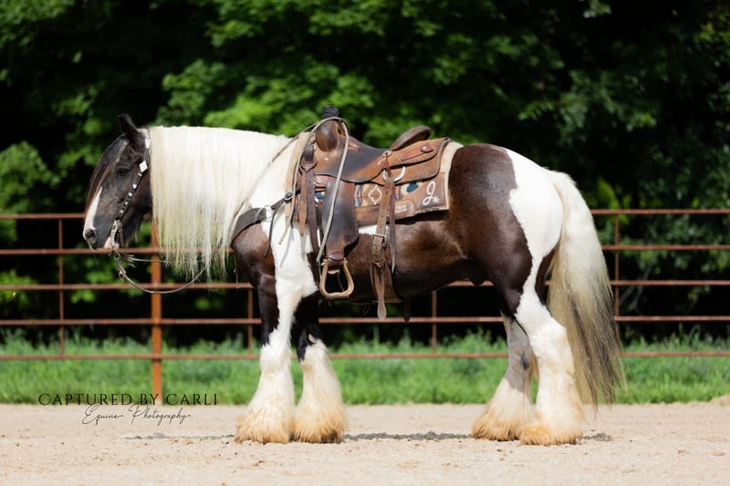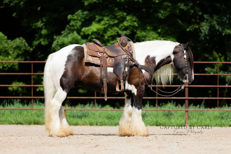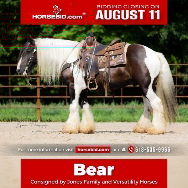 ⚜ The HERITAGE Classic ⚜ Happening now thru MONDAY | AUGUST 11th - Available EXCLUSIVELY on HorseBid's website! For more details and to register visit: www.Horsebid.com CONSIGNOR CONTACT: Jones Family and Versatility Horses 618-535-9966 LOCATION: Lewistown, IL BREED: Gypsy Vanner REGISTERED: No COLOR: Black and White Paint HEIGHT: 14.3 AGE: 7 GENDER: Gelding Bear is the total package — the kind that turns heads and steals hearts. This striking 7-year-old, 14.3 hand Gypsy Vanner gelding checks all the boxes: from his picture-perfect black and white color pattern to his thick mane and tail, he’s a showstopper everywhere he goes. He’s affectionately known as the celebrity of our barn — and not just for his looks! Bear has an outstanding, people-loving personality and the kind of laid-back demeanor that makes him a true joy to be around. Under saddle, Bear is just as impressive. He’s soft, smooth, and responsive, with a solid neck rein and a handle that works equally well on a loose rein or collected up. He rides off your seat and is equally comfortable in English or western tack, making him as versatile as he is fun. Whether you’re trail riding through mountains, rivers, mud, or thick brush — Bear is steady, confident, and absolutely unflappable. He’ll go out alone or fit right in with a group, and no matter how long he’s been off, he comes back to work calm and ready. Bear is well-mannered on the ground — he stands tied or ground ties, trailers easily, and always behaves like a gentleman. He’s seen all kinds of terrain and wildlife, and he’s built to last with excellent conformation, great bone, and strong, healthy feet. If you’re looking for a fun, safe, and eye-catching partner who’s as reliable as he is lovable, Bear might just be your guy. He’s ready to hit the trail, tackle the obstacle course, or just enjoy time with his person.