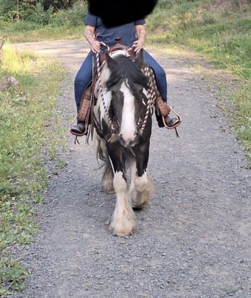 Ferry sucht einen neuen Wirkungskreis in seiner Familie Er ist 8 Jahre und ein ca.1,55 m großer, wunderschöner schwarz-weiß-braun gescheckter Tinker mit hervorragender Abstammung und ganz viel Persönlichkeit. Nun macht er sich auf die Suche nach seiner neuen Familie bei der er ankommen darf. Ferry kennt die klassische Doppellonge, die klassische Handarbeit, die Raumarbeit sowie das Führtraining. Auch die gefahrene Doppellonge ist ihm vertraut. Das Gelassenheitstraining wurde mit ihm gemacht und von ihm zuverlässig absolviert. Im Gelände ist Ferry regelmäßig unterwegs, sowohl alleine als auch mit anderen Pferden. Auch im Straßenverkehr waren wir mit ihm unterwegs, und das macht der Bub einfach nur prima: egal ob Autos, Fahrräder, Traktoren, von vorne oder von hinten, Ferry bleibt gelassen und brav. Unter dem Sattel wird er aktuell weiter ausgebildet. Er geht Schritt, Trab und Galopp und zeigt bereits schöne Ansätze von Schulterherein, Travers sowie Innen- und Außenstellung. Wie es sich für einen gestandenen Tinker und Pony gehört, kann Ferry auch mal meinungsstabil sein. Deshalb wünschen wir uns für ihn eine ebenso meinungsstabile, klare Person, die weiß, was sie will, und ihm liebevoll, aber konsequent den Rahmen gibt, den er benötigt um der treue und liebenswerte Partner zu sein, den man sich als Pferdemensch wünscht. Seine Welt ist ganz klar das Gelände, das liebt der Bub über alles. Draußen ist Ferry eine kleine Motocross-Offroad-Maschine, die einfach nur Spaß macht: überall drüber, überall durch, solange und soweit die Hufe tragen. Genau das ist seine Devise. Selbstverständlich ist Ferry schmied- und verladefromm, scheckheftgepflegt, sozialverträglich sowie an Kinder und Hunde gewöhnt. Ferry ist ein echter Kumpel, ein Draußen-Pferd, ein Typ mit Herz und Charakter. Wir wünschen uns für ihn eine Familie, die ihn so nimmt, wie er ist und Pferdeerfahrung hat. Bei Interesse bitte telefonisch oder über WhatsApp kontaktieren. 0172 4807827