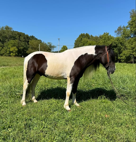 ONLINE AUCTION Place your bids at www.PlatinumEquineAuction.com Starting Bid $3500 Auction ends November 10th, 2024 Need a new saddle? Check out White Rock Saddles on our website or Facebook! Moses a handsome black-and-white paint gypsy cross gelding that is six years old and stance 15.2 hands tall we’ve had this gelding around all summer taking him on several trail rides and enjoying him every chance we can he is a laid-back and gentle horse that is easy to ride, on top of trail riding he has had six months of professional training, which includes desensitizing, laying down on command for mounting as well as dismounting side, passing backing up by using your feet, neck reining, opening and shutting gates. This is a versatile gelding that can take a full days work, whether it be on the trail or the ranch is used to being around cattle and other livestock and never causes any trouble.. nice pretty circles on the correct lead stops on low no matter command he is levelheaded on the trail and will ride for you Point him and he does not care to ride in the front, back or the middle. He talks up quietly and rides off peacefully every time. Located in Grassy Creek, KY. Contact Brandenburg Stables Zach 513-508-3684 with any questions. ONLINE AUCTION Place your bids at www.PlatinumEquineAuction.com Starting Bid $3500 Auction ends November 10th, 2024 Need a new saddle? Check out White Rock Saddles on our website or Facebook!