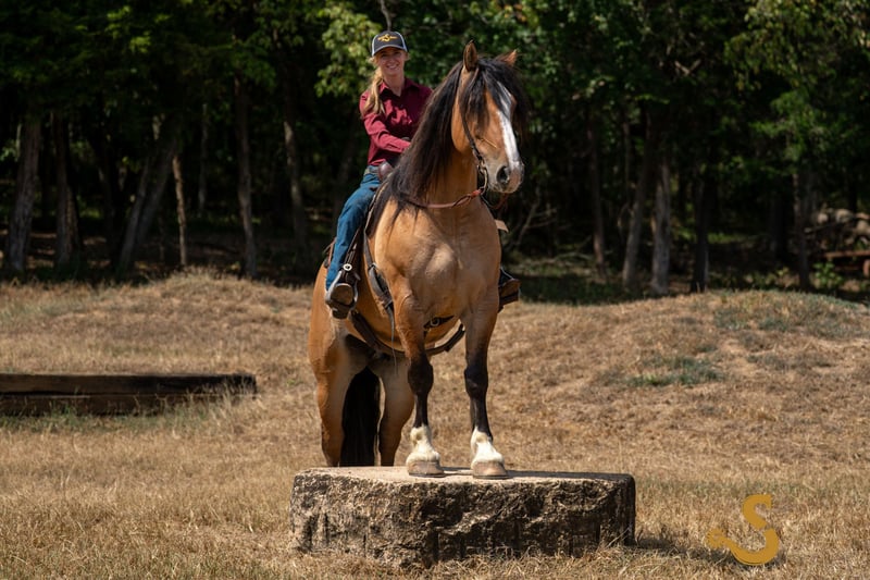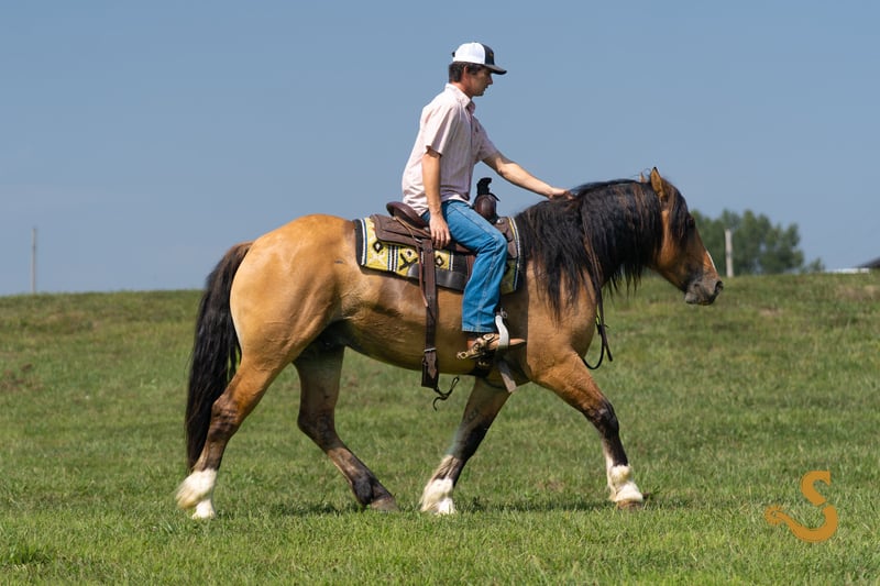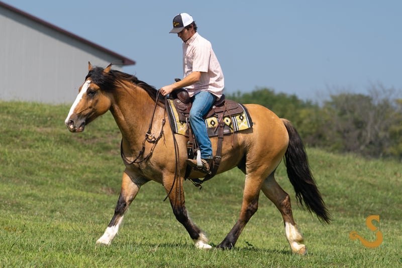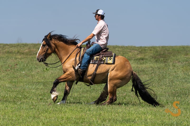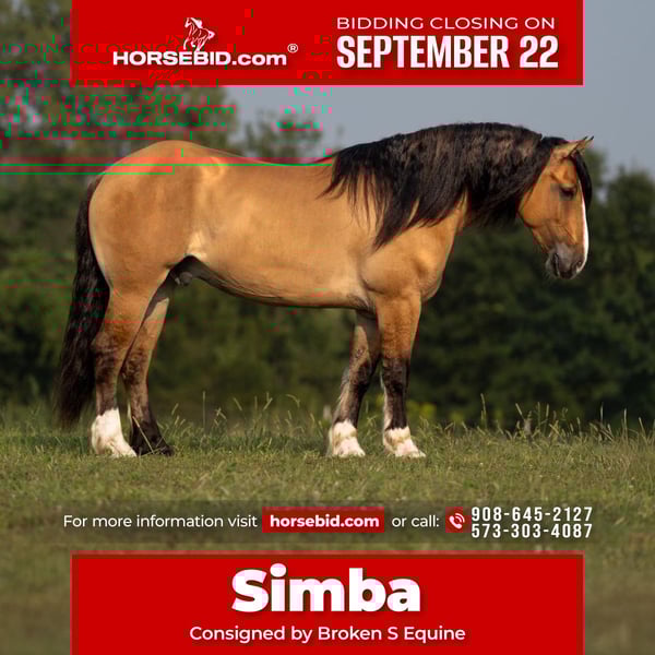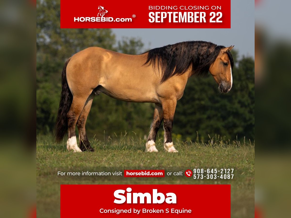 🍁𝒕𝒉𝒆 𝐅𝐀𝐋𝐋 𝑺𝒑𝒆𝒄𝒕𝒂𝒄𝒖𝒍𝒂𝒓🍁 Happening now thru MONDAY | SEPTEMBER 22nd - Available EXCLUSIVELY on HorseBid's website! For more details and to register visit: www.Horsebid.com CONSIGNOR CONTACT: Broken S Equine Kieran 908-645-2127 or Beau 573-303-4087 LOCATION: Bogard, MO BREED: Gypsy Vanner x Quarter Horse x Percheron REGISTERED: No COLOR: Dun HEIGHT: 15.3 AGE: 8 GENDER: Gelding Simba is an 8 year old 1/2 Gypsy Vanner 1/4 Quarter Horse 1/4 Percheron gelding standing 15.3 hands high. Simba has beauty, brains, and a kind personality that makes everyone fall in love! It's hard to pin point the best part about this horse, because he really checks every box. He's a dream in the arena, steady on the trails, and a perfect gentleman in the barn. He is the perfect mix of athletic ability, and slow and steady. Simba is exactly the type of versatile, family friendly, horse that we aim to offer. No matter what discipline you ride, or your experience level, you will enjoy and love this horse. He can go from jumping Novice questions on the xc field, to sliding stops and loping circles like a reining horse. Let the kids climb on him and braid his hair, then saddle him up and take your husband on a trail ride. He is a true all-in-one, safe and fun for the entire family, tried and true partner. In the ring, Simba is broke the very best. He has had extensive training and has the ride ability to be successful in any arena. He is schooling first level dressage tests, and has gone to working equitation clinics. He has great lateral work, pivots, neck reins, and has a great sliding stop. His gaits are smooth and comfortable, with fantastic transitions. He is happy riding on a loose rein, or being round in the bridle. The professional will enjoy him as much as a beginner will. He is tolerant, safe, and steady for the novice rider or kids - yet still has all the moves and education needed to succeed and impress with the experienced riders. You will never find yourself bored in the saddle! On the trails and off property, Simba is sure footed and reliable. He will trail ride alone or in a group, and will happily cross water, ditches, steep hills, and bravely covers any terrain. He is used to loading in the trailer to go new places for trail rides, camping trips, clinics, and schooling. On the cross country field, Simba is a superstar! There was not a single question that fazed him. He is adjustable, brave, and easy! He would be a phenomenal choice for the hunt field as well. He is quiet minded, smart with his feet, and already used to the fences, varying terrain, and environment. In the barn, Simba is a kind and gentle soul. He is used to the kids being around him, braiding him, and loving on him. He's a very good boy for all of the usual barn tasks, and stands like a gentleman for bathing, grooming, the farrier, and vet. He is easy to load on the trailer, stand tied to and on the trailer, and is overall an easy guy to be around. He is happy living inside or out, and gets along with mares and geldings in turnout. Simba is a horse to gain your confidence with, a horse to relax after a long day with, and a horse you can try new things with. ⚫️Simba is an easy keeper that requires no maintenance. We have a recent, clean vet check on file. ⚫️Our program aims to train and produce top quality horses and ponies for all disciplines and experience levels. ⚫️We are located in Bogard, MO. We can help you arrange shipping anywhere! ⚫️For more information about Simba, or any of our other horses call or text us. Kieran 908-645-2127 Beau 573-303-4087