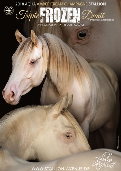Triple Frozen Dunit is een stichtingsgefokte QuarterHorse hengst, duidelijk staand in het cowhorse/ranch horse type. Veel botsterkte en een super geweldige basis leggen de solide en gezonde basis voor een lange levensduur en robuustheid. De zachte en harmonieuze gang, met uitgestrekte bewegingen, geeft inzicht in de kwaliteiten van een optimaal toekomstig zenuwsterk ranchpaard, dat altijd solide, betrouwbaar en gewetensvol zijn werk doet. "Frosty" is een van de zeldzame homozygote AMBER CREAM CHAMPAGNE Foundation hengsten in Europa! De speciale kleur Champagne, die deze mooie en uiterst charmante hengst 100% doorgeeft aan zijn nakomelingen, rondt het totale optische pakket expressief af. "Frosty" is een super coole en zenuwsterke hengst. Hij kent geen angst en raakt rustig betrokken bij alles wat hem is toegewezen.