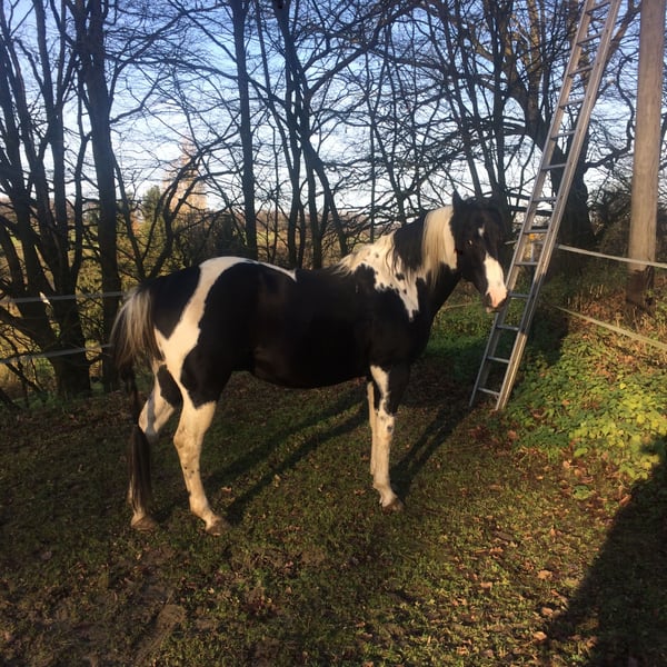 Unbearable Chic, chiamato Bartl, è uno stallone che non lascia nulla a desiderare. È stato autorizzato come stallone premium ed è omozigote per il Tobiano. Per questo diamo una garanzia di colore al 100%. Finora ha partorito solo puledri in bianco e nero o marrone scuro e bianco. Ha una natura gentile ed equilibrata che trasmette ai suoi figli. Con la sua altezza di 153 cm, rappresenta il tipo old stock con una forte muscolatura e una buona base e corre facilmente senza scarpe. Addestrato per il reining, viene cavalcato come cavallo da tempo libero e da trail. Durante una traversata delle Alpi in solitaria, senza altri cavalli, ha attraversato un tunnel senza problemi mentre il traffico era in movimento. Sta al pascolo con la sua cavalla ed è semplicemente una gioia da gestire. Ne sarete entusiasti!