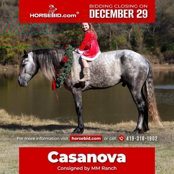 ⚜️𝐓𝐇𝐄 𝓗𝓮𝓻𝓲𝓽𝓪𝓰𝓮 𝐖𝐢𝐧𝐭𝐞𝐫 𝓒𝓵𝓪𝓼𝓼𝓲𝓬⚜️ Happening now thru MONDAY | DECEMBER 29th - Available EXCLUSIVELY on HorseBid's website! For more details and to register visit: www.Horsebid.com CONSIGNOR CONTACT: MM Ranch 419-318-1902 LOCATION: Forney, TX BREED: Warlander REGISTERED: No COLOR: Dappled Gray HEIGHT: 16 AGE: 4 GENDER: Stallion Are you ready to be in AWE!! Look at this one!! This is CASANOVA!!! A true one in a lifetime Warlander. The kind of horse you didn’t know you needed in your life. The kind of horse that should be in the movies!! Casanova is just turning 4 yrs old and is stunning dappled gray WARLANDER STALLION. Standing 16 hands tall. Yes 16 hands. He is a big stout long legged guy. He is half Friesian and half Lusitano. We know the people that bred and raised him. They owed both parents. They specialize in the warlander breed. They hand raised this magical creature. He has been handled since the day he was born. He is gentle and kind. He has a naturally docile gene. He truly loves to be around people. He meets you at the gates. Loves attention. Very playful. Absolutely loves balls and rope toys. Loves to carry them around tossing them in the air. He is so much fun not only to ride but just also be around. Very quit and easy to handle. We have never had to use a stud chain on him. Not even around mares in heat. If you tell him no he will not even look at them. He knows lots of fancy moves. Started correct with an excellent foundation. Has a very unique way of traveling. He rides nothing like a quarter horse. Imagine driving a Porsche. That is what it’s like riding him. He has been thought some dressage. He is young athletic, intelligent, versatile. Ready to go on and do big things. He would make an excellent show horse. Whether is dressage or jumping. Or just use him as a trail horse. He rides both English and western. Doesn’t matter to him. He just wants to please. We made the decision to leave him a stud so can use him bred if wanted. Imagine the beautiful babies he would sire. He is the quietest most well behavior stud!! He is in a paddock with 2 mares and miniature gelding pony!! He is not mean or hard to handle. When you ride him he acts just like a gelding. Yes you could easily make him a gelding if you wanted. But wanted to leave that option open. How could you have a bad day when you have this guy in your barn!! If you would like anymore info on Casanova please call. We would love to talk to you about him. He is up to date on shots, new coggins test, up to date on vaccinations, just had his feet trimmed. He has wore shoes but absolutely does not need them. He has perfect black feet. He is 100% sound. No maintenance. He is a very easy keeper. We can and will help arrange shipping anywhere needed.