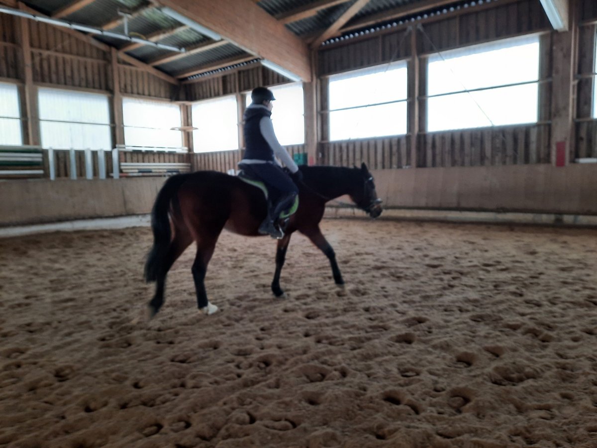 Pari ist 8 Jahre alt und hat ein Stockmaß von 1,53 . Sie ist somit eine kleine Warmblutstute. In den letzten 3 Jahren wurde sie regelmäßig dressurmäßig gearbeitet . Sie hat sehr schöne Bewegungen, ist angenehm zu reiten und zu sitzen. Im Gelände ist sie unerschrocken und nervenstark, auch ein vorbeifahrender Schneepflug macht ihr nichts aus. Auch beim Freispringen macht sie eine gute Figur, Videos vorhanden. Pari hat auch eine Fahrausbildung durchlaufen und das Zubehör, Sattel und Zaumzeug wären dabei. Ich habe sie nun 6 Jahre, sie war noch nie lahm oder krank. Pari steht im Reitstall und wird regelmäßig gearbeitet. Videos mit Trab und Galopp können angefordert werden.