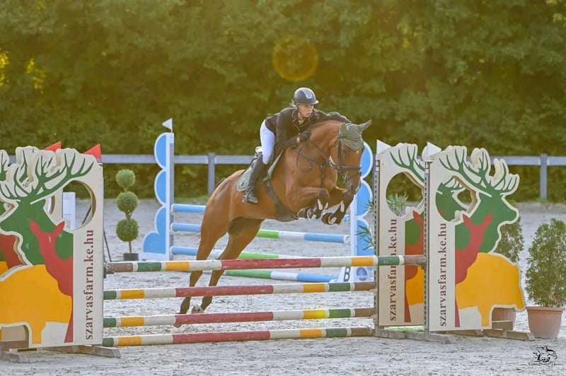 For sale is a 2017-born, approximately 16.1 hh light brown Hungarian Warmblood mare. This young lady has a friendly temperament and is well-behaved in handling. Under saddle, she moves obediently in all three gaits and has competed up to 1.10 m at shows, having also successfully cleared higher jumps in training without any issues. Due to her pronounced temperament and strong impulsion at the jump, she is not suitable for complete beginners, as she is very sensitive and attentive in the arena and aims to please her rider. The mare is currently shod in front, is familiar with the blacksmith, veterinarian, and loading and traveling.