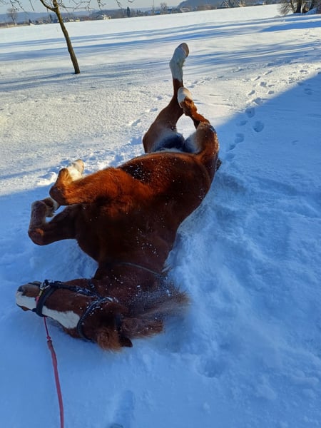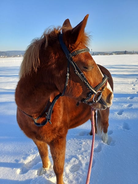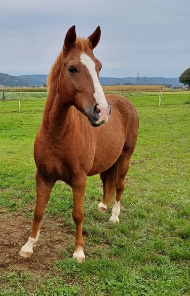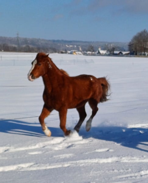 Our dear Phillino is 10 years old, approximately 15.4 hands high, and has been barefoot for the past six months. He is well-trained under saddle and very willing to work. His joy is immediately evident when you actively engage with him. Shortly after his arrival with us in autumn 2025, we received a veterinary diagnosis. Currently, Phillino is not fully rideable as initially intended when we purchased him. The diagnosis reveals an older, healed collateral sesamoid fracture and a resulting injury to the left hind limb. Before coming to us, he was ridden in the arena and on trails in all three gaits, which reportedly went well according to the previous owner. However, I have observed that he takes a few days to unload his leg after riding, indicating some pain. I certainly do not want to subject him to this long-term! He loves going for walks—alone or with company—absolutely no problem there! He is eager to learn, playful, even knows a few tricks, and is very people-oriented. He allows touch and cuddling everywhere and gives a lot back to his human. Phillino is exceptionally intelligent and creative—an ideal horse for groundwork and circus tricks! I can easily imagine that he can still be ridden in walk, even by children—perhaps in therapeutic riding sessions!? In daily life, he appears to be pain-free. He gallops across the pasture as if everything is fine. He is straightforward during hoof care and veterinary visits. All in all, Phillino is a loyal leisure partner who has unfortunately had quite a bit of bad luck in his life. I simply do not have enough space to keep him as a companion horse here. Therefore, I am looking for a suitable forever home where he can enjoy life on the pasture and in a herd, and where he can show his willingness to work during walk-paced activities! X-ray images and the veterinary report can be viewed and provided upon request. There is also tack available, which can be purchased optionally—including a beautiful, high-quality, custom-fit saddle.