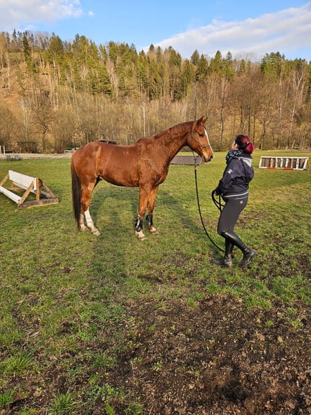 Te koop staat een zeer levendige 10-jarige ruin genaamd Frechdachs. Hij leeft helemaal op zijn naam en je zult je zeker niet vervelen met hem. Hij kwam in februari 2024 bij mij en ik moest helemaal opnieuw beginnen met hem. Zo gezegd, hij is pas sinds mei van dit jaar echt onder het zadel geweest. Hij is braaf, leergierig en leert snel – maar hij heeft een stevige, zelfverzekerde ruiter nodig. Helaas is Frechdachs erg schrikachtig en oplettend. Straatverkeer, vrachtwagens, auto's en tractors vormen geen probleem. Het zijn vooral dingen die hij niet herkent of geluiden die hij niet ziet. Met een tweede paard, of het nu tijdens een buitenrit, op het rijterrein of naast de wei is, voelt hij zich meteen zekerder. In de omgang is hij ongelooflijk braaf en erg voorzichtig tegenover mij. Hij is zeer vriendelijk en past zich makkelijk aan. Ik werk bijna dagelijks met hem: rijden, grondwerk en vrijheidsdressuur. Ik geef hem met pijn in mijn hart weg ❤️, maar het is helaas door tijdgebrek.