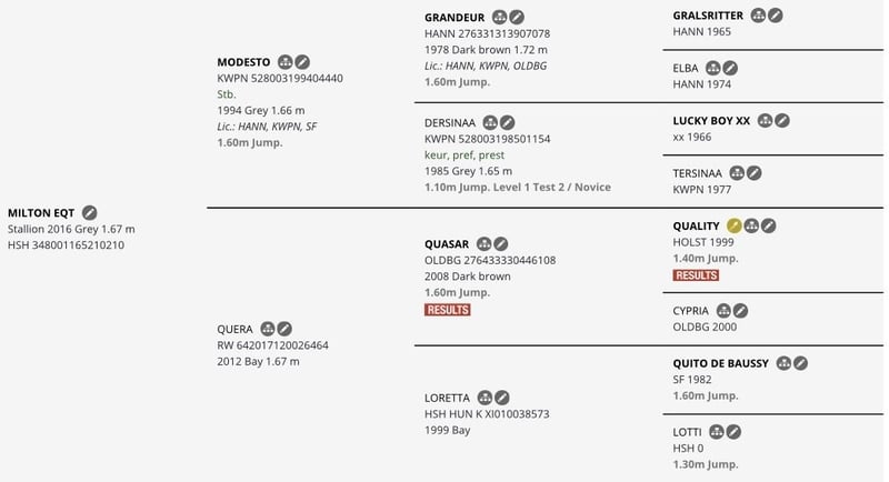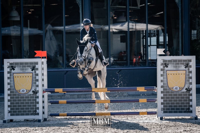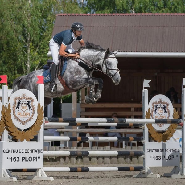 Milton (JPC Modesto x Quasar x Quito du Baussy) (2016, 167 cm) is a very well-trained and calm sport horse. He has competed in 1.20 m classes with a professional rider and 1.00 m classes with amateur girls (winning many competitions). He very rarely touches a rail. He often achieves the best time in the class without rushing, and he is able to turn easily. He has no bad habits — he does not bite or kick; he stands well for shoeing, loads easily into the trailer, and enjoys hacking out in nature. Milton (JPC Modesto x Quasar x Quito du Baussy) (2016, 167cm) este un cal de sport foarte lucrat și cuminte. A evoluat în probe de 1.20 cu un călăreț profesionist și probe de 1m cu fete amatoare (multe probe câștigate). Foarte rar lovește o bară. Scoate des cel mai bun timp din probă, fără să fugă, e capabil să se întoarcă ușor. Fără obiceiuri proaste, nu mușcă , nu lovește; stă la potcovit, se încarcă ușor în remorcă și îi plac plimbările în natură.