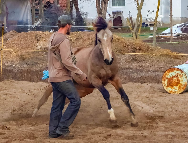 4yr old bucksin gelding for sale. Talented, open warmblood, ready to to be ridden in most any discipline. Trained according to classical principles, with natural horsemanship approach. Introduced to the bit recently without any problems. Basic lateral work, shoulders-in/out, haunches-in/out. Can do schoolhalt and the beginnings of passage. With the right guidance he can be a dreamhorse to the right horseman. Used to regural hoofcare, been trimmed a lot in liberty. 158cm at the withers. Feel free to contact me on WhatsApp for up to date info on Darius!