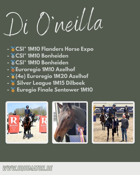 Di O’neilla DC Stables Z mare Born 2014 Denzel van het Meulenhof x Kennedy A mare with a strong winning mentality, consistently delivering flawless and fast rounds. She has already accumulated numerous wins and podium finishes in her record: - 🥇 CSI* 1.10m Flanders Horse Expo (20/02/2025) (see second video) - 🥈 CSI* 1.10m Bonheiden (27/09/2024) - 🥈 CSI* 1.10m Bonheiden (28/09/2024) - 🥉 Euroregio 1.10m Azelhof (07/01/2024) - 🏅 (4th) Euroregio 1.20m Azelhof (19/08/2022) - 🥇 Silver League 1.15m Dilbeek (21/05/2022) - 🥇 Euregio Final Sentower 1.10m (07/11/2021) Di O’neilla measures 164 cm. She is well-behaved during transport and in the woods. ✅ Therefore, she is more than suitable for a competitive rider looking for a reliable competition horse. Price: €18,000 excluding VAT For questions or interest, please feel free to contact us at: +32 470 65 29 56 #equimatchbe #equimatch #horseforsale #showjumpinghorseforsale
