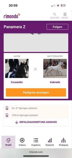 Panamera ist eine 12 Jährige Stute, die direkt vom Züchter kommt. Sie hat unzählige Schleifen in Klasse M gesammelt und war platziert in Klasse S . Sie gibt dem Reiter viel Sicherheit am Sprung. Sie kann manchmal etwas zickig sein und ist fein im Maul, aber wenn man weiß damit umzugehen, ist dies garkein Problem. Am Ende hat sie viel Spaß am Springen, eine gute Einstellung und ist in der täglichen Arbeit schön zu reiten. Geeignet auch für einen Reiter auf A Niveau, der ein Lehrpferd sucht um in die nächsten Klassen zu kommen.