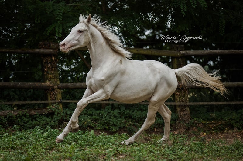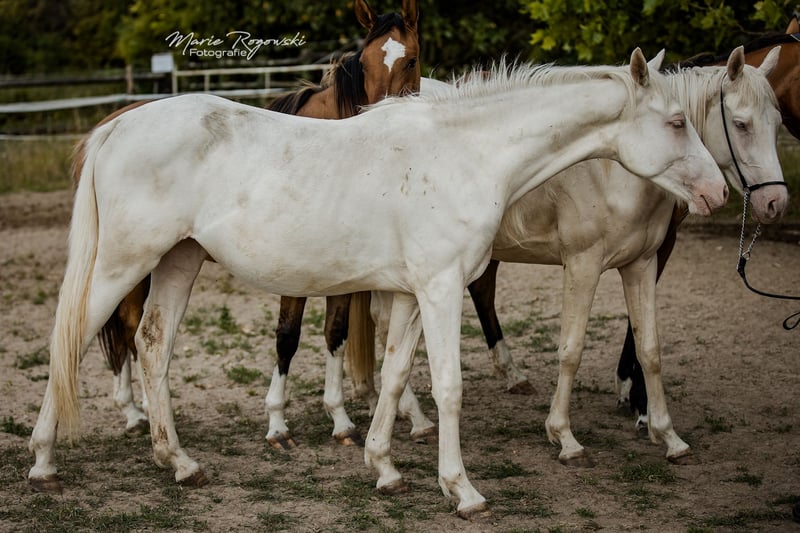 DOUBLE CREAM Z ha heredado lo mejor de sus dos padres cremello, el semental premium DON CREAM GF y WHIPPED CREAM GF. Como un ser de cuento de hadas, flota como un unicornio etéreo hacia el atardecer... o también le gusta ensuciarse, ya que puede vivir al aire libre 24/7/365 con sus compañeros en un grupo de yeguas de diferentes edades. Es la última cría de la icónica criadora de caballos de color Gwendolyn Gregorio y nació con nosotros solo después de su fallecimiento. El resultado de un desarrollo de cría desde 1978 con un plan y objetivo claros. El semental premium DON CREAM GF (última imagen) se destaca por su árbol genealógico artístico (DREAM OF GOLD - MASCARPONE GF), que representa en todos los aspectos. Su descendencia en Inglaterra es impresionante. En nuestra cría, siempre ha producido calidad. WHIPPED CREAM GF (WIN THE GOLD - MALTESER GOLD) ya tiene crías que son yeguas de cría exitosas en Europa, emparejándose con éxito en cualquier disciplina deseada. Es apta para el libro de cría principal de Westfalia, Renania, Oldenburg, DSP y ZSAA sangre noble alemana. El padre materno WIN THE GOLD ha influido en una gran generación alrededor de la cría Falkenhorst y luego se trasladó a Australia, donde continúa enriqueciendo el mundo del caballo de sangre caliente. Nuestro objetivo de cría son caballos de ocio versátiles para el propietario de caballos tradicional, que como buen jinete fomenta y gimnasia a los animales en armonía con su desarrollo según la enseñanza clásica. Los potros crecen en grupos mixtos en grandes praderas al aire libre durante todo el año. El suelo más bien árido fortalece a los jóvenes, que reciben alimentación complementaria adecuada, con acceso libre a heno y paja orgánicos y minerales, adaptados a sus necesidades energéticas. Se desparacitan regularmente (ZSE) y se mantienen los pies en forma con ortopedia equina. La cría se maneja de manera holística y prioritariamente con medicina natural. Tienen contacto diario con nosotros, los humanos, y disfrutan de ello. Ya conocen muchas cosas de la vida cotidiana, incluso en el recorrido de suelo, el round pen o bajo el solárium. Sin embargo, debemos dejarlos ir, solo a las mejores manos. Pasaporte Zangersheide "sección principal" (libro de cría principal) y registro IFCE (Facteur Selle Francais). Todo lo demás en una conversación personal. El animal puede quedarse para su crianza en condiciones muy favorables. El propietario tiene a su disposición nuestras casas móviles en la cría para visitas regulares.