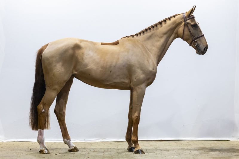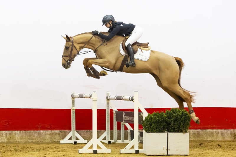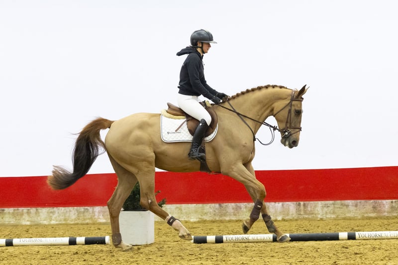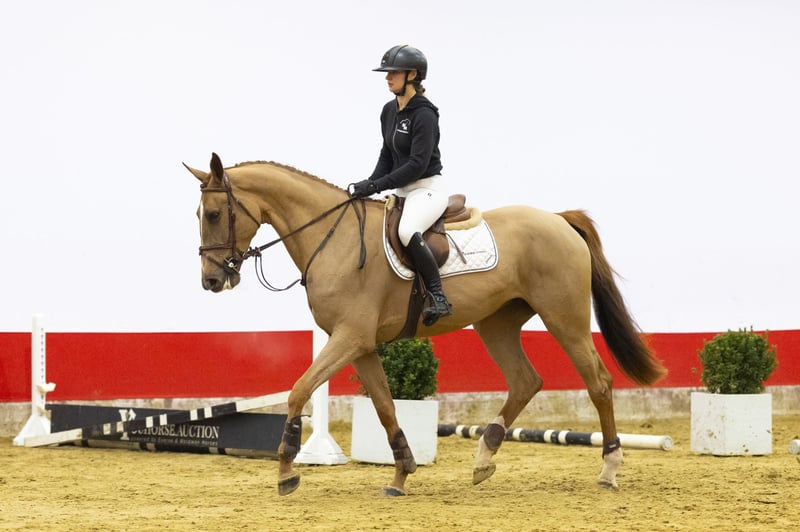 Ready to jump a practice course. A large-framed mare with pedigree. She has excellent vision over the jump and jumps with great scope. She takes off quickly and has good jumping technique. She is easy to ride and shows a correct attitude in her work. A sport-oriented horse with quality and power over the jump.