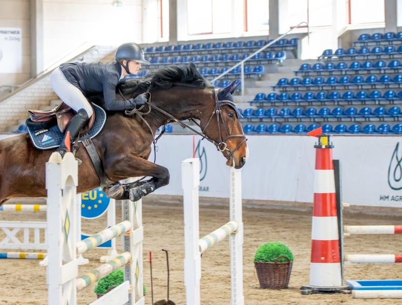 Zum Verkauf steht eine 6-jährige Dunkelbraune Zangersheider Stute mit einem Stockmaß von 1,75m. Sie verfügt über eine raumgreifende Galoppade, die sich zwischen den Sprüngen bereits gut verändern lässt. Die Stute verfügt über sehr viel Intelligenz und Übersicht am Sprung und ist mit viel Vermögen ausgestattet. Sie wurde erst Ende 2025 das erste Mal auf dem Turnier vorgestellt, konnte aber bereits Platzierungen bis zur Springpferde-L sammeln und ist zuletzt auch eine gute Runde in der ersten Springpferde-M gegangen. Am Sprung zeigt sie sich stets unerschrocken und ist auch bereit, unpassende Distanzen auszugleichen. Die Stute ist mit genügend Go ausgestattet, kein Anfängerpferd und benötigt aufgrund ihres Ausbildungsstands einen einfühlsamen Reiter. Sie kommt direkt aus erster Hand und wird im Auftrag des Züchters verkauft.