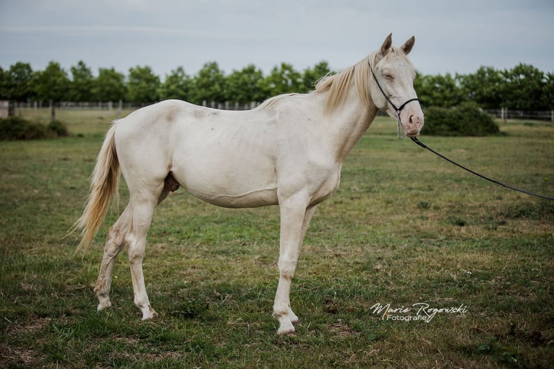 Warmblood stallion | Perlino | born 2022 | currently growing Zangersheide main studbook + IFCE (Facteur Selle Français) Genetics: E/_, A/_, CR/CR Castration possible on request WIN MY HEART Z is a young, currently still lanky young stallion, very friendly, curious and easy to handle. He is growing up in a mixed-age group of young stallions, knows daily contact with people and is familiar with basic procedures. Sire: WHITE WINE GF with proven lines via WELTMEYER, WOERMANN, LADYKILLER, NOTAR Dam: PHANTASIA GF, award-winning and proven Oldenburg mare in buckskin, with internationally successful offspring Dam's sire: NARISTON OLD - sporty Oldenburg stallion with solid heredity Bred in the seventh generation at his own stud (Falkenhorst Stud, since 1978), with a high Hanoverian content and a dash of English thoroughbred Many breeding paths are open to him: e.g. KWPN, Zangersheide, Royal Belgium Warmblood, Anglo European Studbook.