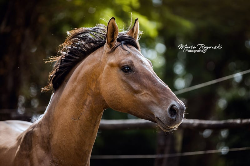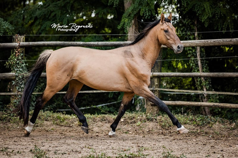 Zangersheide stallion in bay dun | born 2018 | 163 cm Approved stallion for AES, Zangersheide Genetics: E/e A/a D/n Tested free of ECVM, PSSM2, MFM, RER (CAG Panel) Fabelkönig is a stallion with great presence and impeccable behaviour. He was broken in in 2024 and shows enthusiasm and great potential. Since then, he has not been able to be worked on further due to time constraints, but would be ready to start training immediately. Fabelkönig is perhaps the only licensed warmblood stallion that passes on the dun colour. He got his colour from his dam Funny Girl, also a bay dun mare who can be viewed at our stud. Three other offspring from the same dam can also be viewed at our stud. At the renowned Trakehner stud farm in Merzdorf, the licensed Norwegian Fjord horse stallion Emil *1972 covered the English thoroughbred mare Feinsliebchen, who is registered in the main stud book of German Trakehner breeding. The Trakehner Association and later the ZfDP recognised this and the filly qualified for the main stud book. This is Funny Girl's grandmother. This means that Fabelkönig now has foreign blood in the 4th generation and his foals are therefore eligible for registration with many renowned sports associations. Fabelkönig's sire is the Spree stallion Fürst Wilhelm, carrying every big name there is when it comes to dressage lineages, and his sporting career speaks for itself.