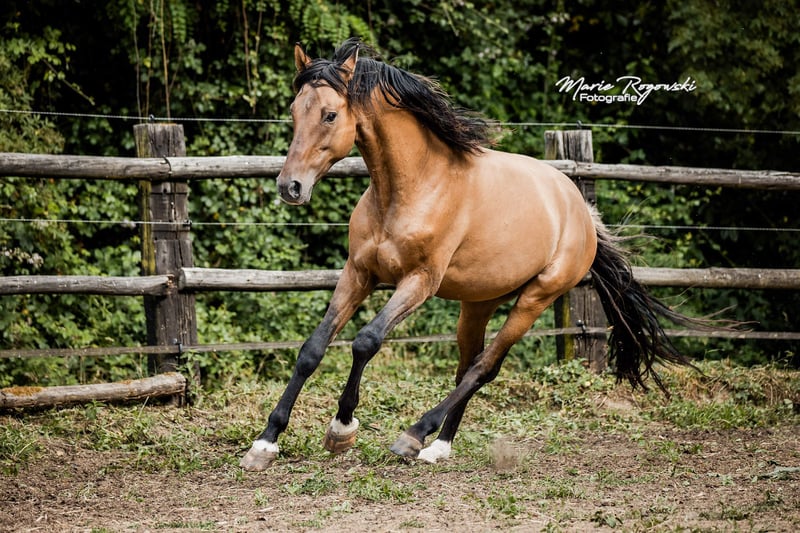 Zangersheide stallion in bay dun | born 2018 | 163 cm Approved stallion for AES, Zangersheide Genetics: E/e A/a D/n Tested free of ECVM, PSSM2, MFM, RER (CAG Panel) Fabelkönig is a stallion with great presence and impeccable behaviour. He was broken in in 2024 and shows enthusiasm and great potential. Since then, he has not been able to be worked on further due to time constraints, but would be ready to start training immediately. Fabelkönig is perhaps the only licensed warmblood stallion that passes on the dun colour. He got his colour from his dam Funny Girl, also a bay dun mare who can be viewed at our stud. Three other offspring from the same dam can also be viewed at our stud. At the renowned Trakehner stud farm in Merzdorf, the licensed Norwegian Fjord horse stallion Emil *1972 covered the English thoroughbred mare Feinsliebchen, who is registered in the main stud book of German Trakehner breeding. The Trakehner Association and later the ZfDP recognised this and the filly qualified for the main stud book. This is Funny Girl's grandmother. This means that Fabelkönig now has foreign blood in the 4th generation and his foals are therefore eligible for registration with many renowned sports associations. Fabelkönig's sire is the Spree stallion Fürst Wilhelm, carrying every big name there is when it comes to dressage lineages, and his sporting career speaks for itself.