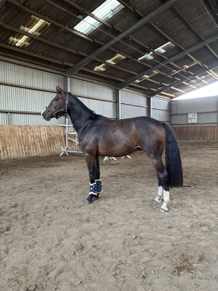 Stalypso x Colcannon (Stakkato x Cornet Obolensky) Calimero est un hongre de 4 ans, mesurant actuellement environ 1,64 m, mais de construction robuste, avec une personnalité très sympathique qui ne laisse personne indifférent. Il a été formé selon son âge chez nous, est déjà monté en selle et montre dès maintenant un potentiel impressionnant lors du saut en liberté. Sa mère a obtenu des résultats jusqu'à la classe M, et son père est bien connu – des conditions idéales pour une carrière sportive prometteuse. (D’autres vidéos, ainsi que des images de ses séances de saut et de monte, peuvent être envoyées à tout moment.) En comportement, Calimero est un véritable trésor : extrêmement gentil, obéissant et très facile à gérer. Il se laisse charger, ferrer, manipuler au quotidien – tout se passe sans problème. Un jeune hongre qui procure simplement du plaisir et travaille toujours avec amabilité. Important ! En raison d’une blessure à la main dont je souffre actuellement depuis 3 semaines, il n’a pas été monté récemment. Prix à discuter.