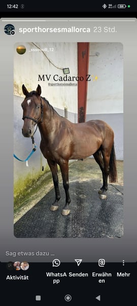 MV Cadarco Z, geboren in 2018, wurde von uns selbst gezogen und ausgebildet. Seine Eltern sind MV Casscato (Cassini x Locato) und die Mutter Delaware (Douglas - Darco). MV Cadarco Z ist ein äußerst zuverlässiges Pferd. Es hat keine Angst vor irgendetwas, geht mutig voran, derzeit in Springprüfungen bis 120 cm, Training bis 130 cm. Es lässt sich sowohl alleine als auch in der Gruppe auf Ausritten, Messen usw. mitnehmen. Derzeit nimmt MV Cadarco an Turnieren bis 120 cm mit seiner Reiterin Marina Morro teil. Es hat das Potenzial für noch höhere Leistungen. Ein leicht zu reitendes und äußerst wendiges Pferd, das Freude bereitet. MV Cadarco eignet sich auch für Anfänger. Es ist ein aktives, aber sehr kontrollierbares Pferd. Wir haben es mit fast 6 Jahren eingeritten, sodass es seine Entwicklung in unseren weiten, natürlichen Weiden frei und entspannt genießen konnte. Das Pferd ist gesund und barhuf. Besichtigung und Proberitte sind unverbindlich möglich. Wir sprechen: Spanisch, Deutsch, Englisch. Tierärztliche Untersuchungen sind möglich, die Kosten trägt der Käufer. Preis: 20.000 € VB