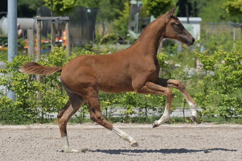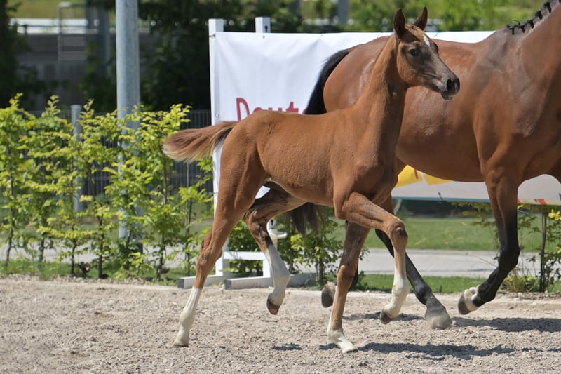 This beautiful and very correctly built dressage mare was born on March 23, 2025. She is an exceptional specimen - long-legged, elegant, chestnut, and with four white socks. She is an embryo transfer foal from the famous Vitalos. Her mother, Quality Time, is 10 years old this year and an Oldenburg elite mare - pedigree: Quantensprung/Placido. Quality Time has been successfully competing in dressage for years and has won all her tests in 2025 so far. M**, S*, and S** victories all with scores of 69-70%. She is currently nearly S*** ready and will make her debut at this level this season. Quality Time was also qualified for the Bundeschampionat as a 5-year-old. With this beautiful and talented filly, you are securing the future! The sale is directly from the breeder. The mother is also with us and can be viewed. !! The mare with which the foal is at foot is not the genetic mother but a surrogate mother. The ridden black mare in the videos/pictures is the genetic mother. Additionally, we are selling a full brother to this foal, born on March 10, 2025.